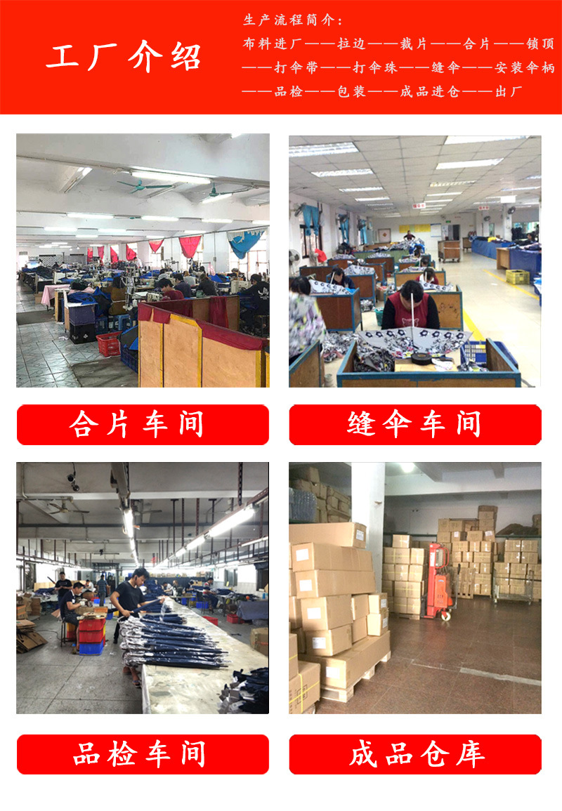 如今,我司年产雨伞超500万支,年产值达1.2亿元,客户遍布全球。我司主要产品包括:高尔夫伞,折叠伞,直杆伞,太阳伞,遮阳伞,晴雨伞,风扇伞,LED伞,特色伞,儿童伞,广告促销伞,礼品伞,沙滩伞,帐蓬,雨衣,雨披,各式手袋,毡包,背包等。长期服务于奔驰(日本),宝马,农业银行,招商证券,沃尔玛,POLO,TCL集团,KFC,万达,万科等;诚信,实力、质量获得一致认可!