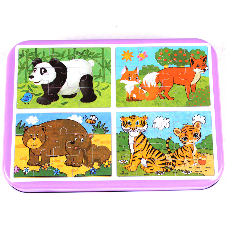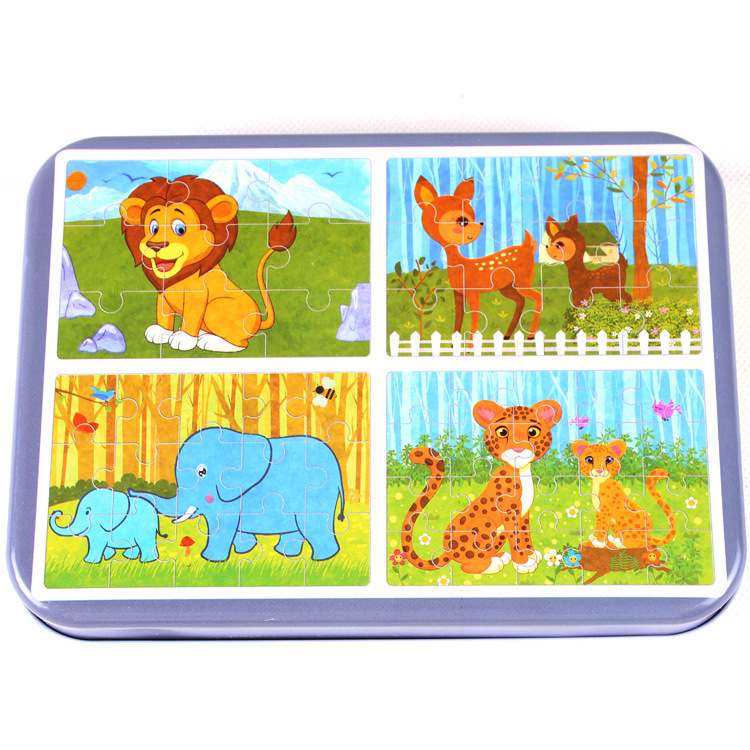 국경 간 나무 어린이 직소 퍼즐 4 대 1 철 박스형 동물 직소 퍼즐 아기 교육 장난감 평면 직소 퍼즐스토어 가기