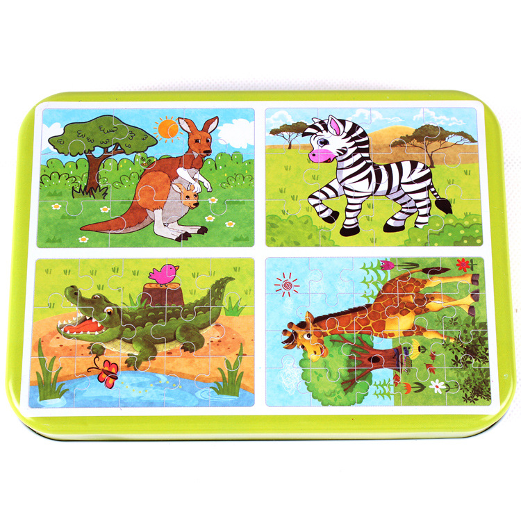 국경 간 나무 어린이 직소 퍼즐 4 대 1 철 박스형 동물 직소 퍼즐 아기 교육 장난감 평면 직소 퍼즐