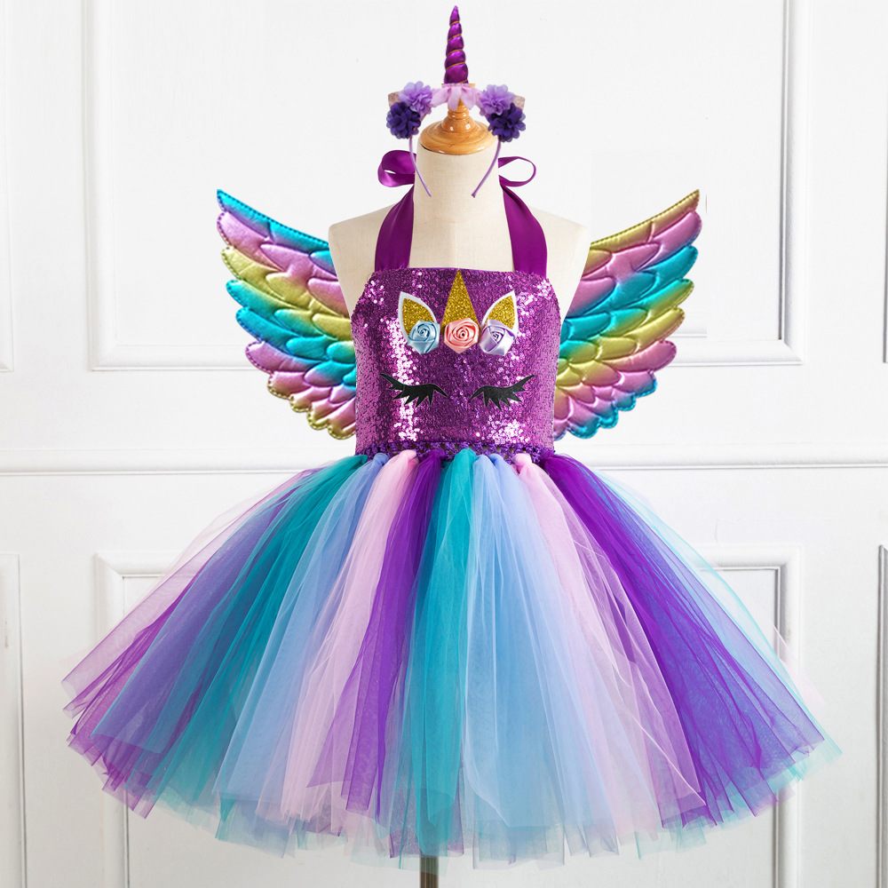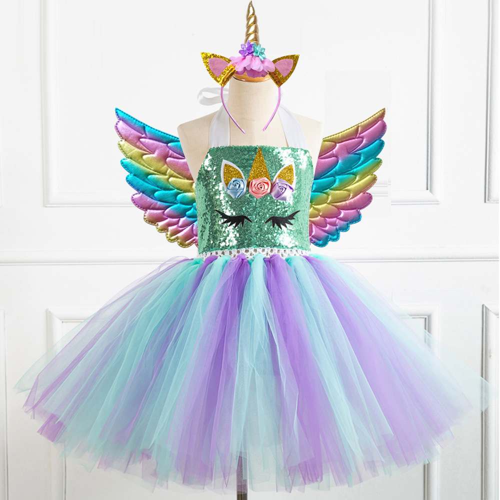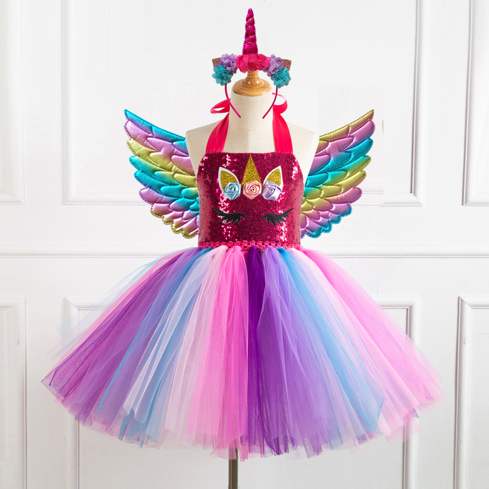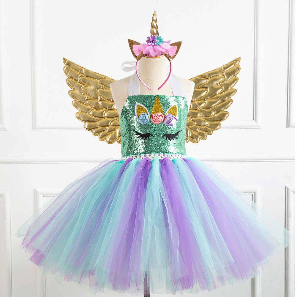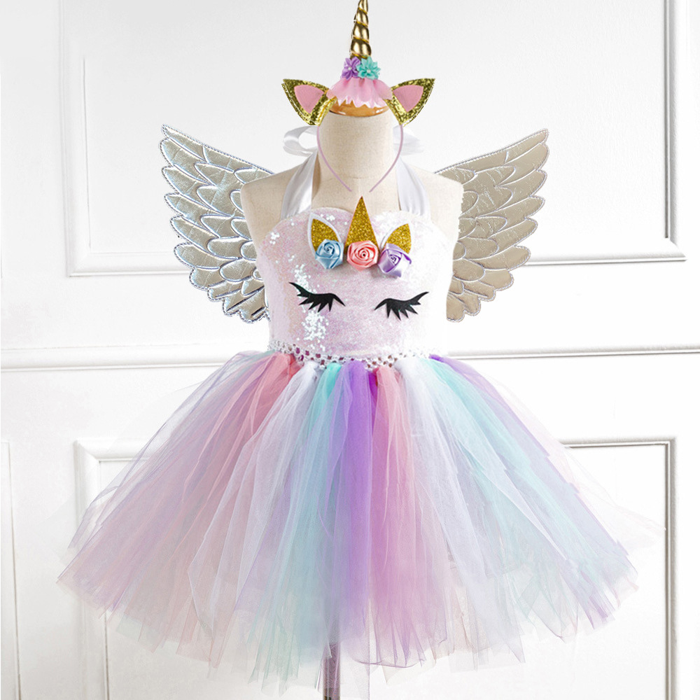• 2023新款彩虹亮片女童连衣裙欧美公主裙卡通独角蓬蓬裙送翅膀头饰