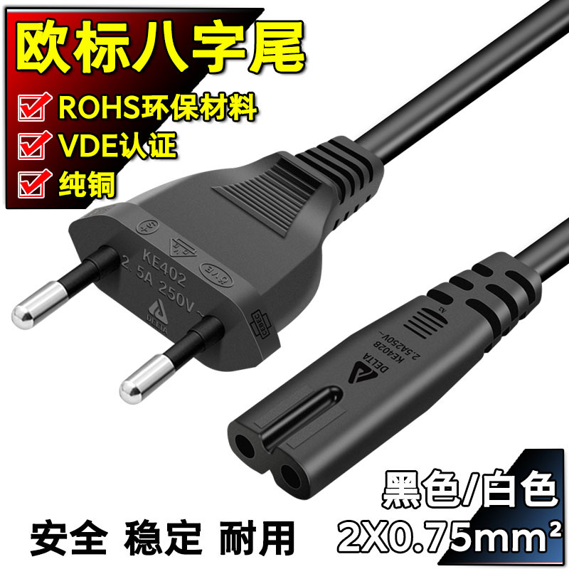 VDE 순수 구리 유럽 표준 전원 코드 2 플러그 8 테일 LCD TV 책상 램프 오디오 프린터 2 코어 8 테일