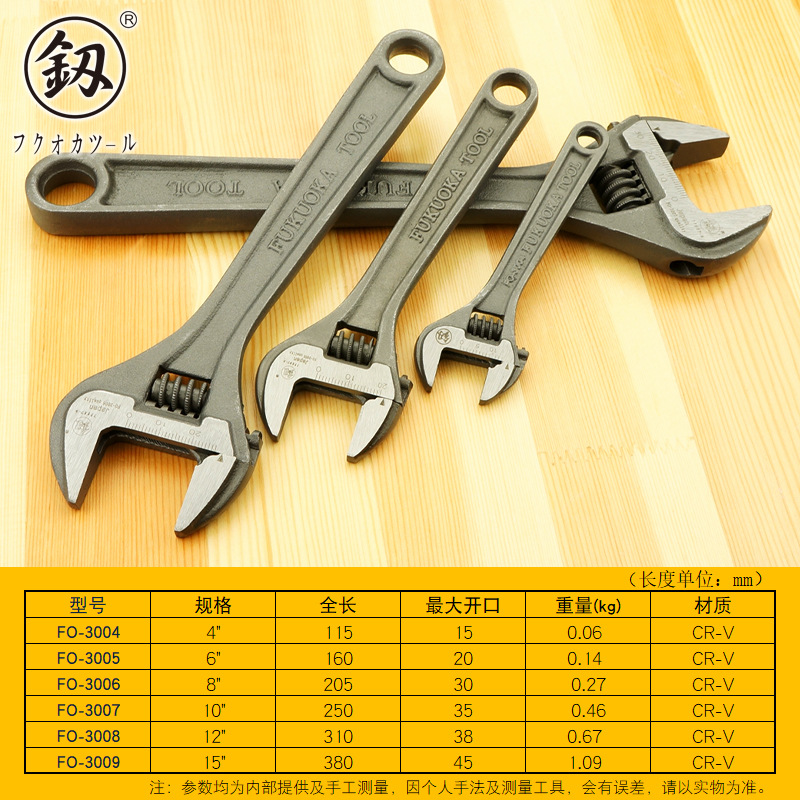 후쿠오카 Xue 브랜드 산업용 헤비 듀티 조절 렌치 오픈 엔드 플레이트 4 인치 소형 조절 렌치 18 인치 렌치 도구스토어 가기