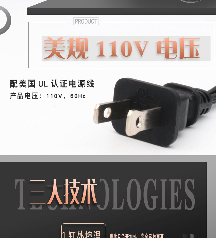 本产品额定工作电压为110V,为外销专用产品,国内不可用,国内使用请选店内国内市场220V款