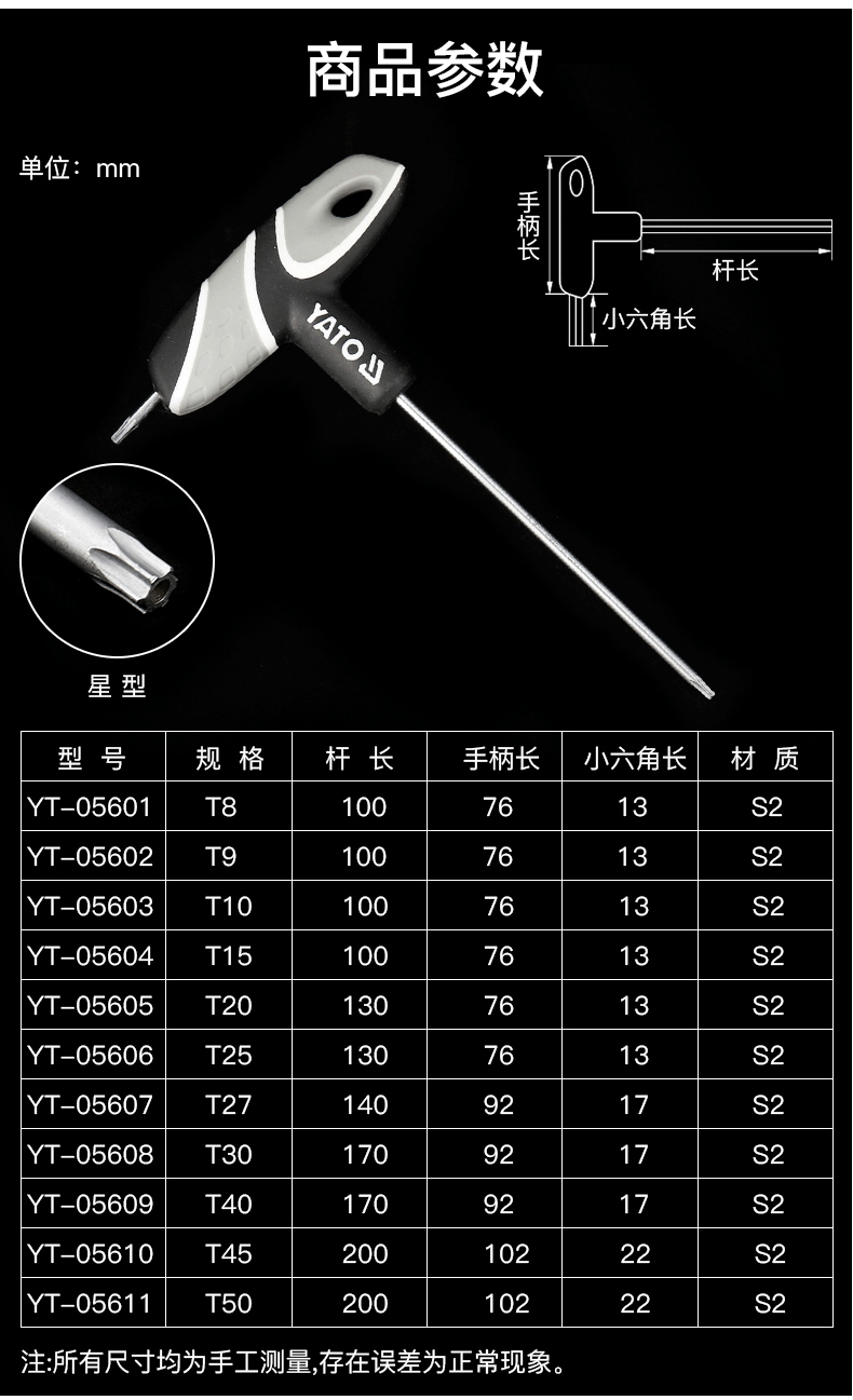 YATO 알렌 렌치 t 유형 단일 별 Torx 내부 육각형 도구 내부 6 육각형 앵글 드라이버