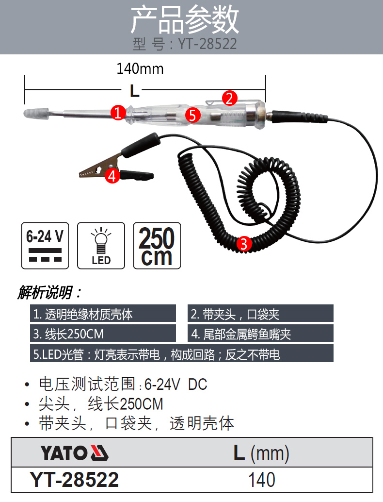 YATO 자동차 전기 프로브 6V12V 수리 유도 전기 프로브 자동차 전기 프로브 자동 수리 자동차 보험 도구