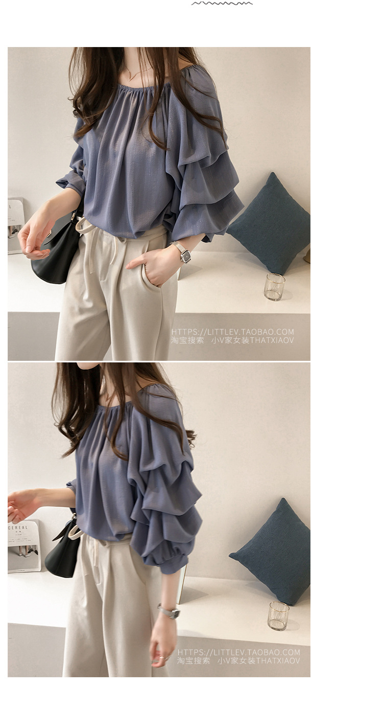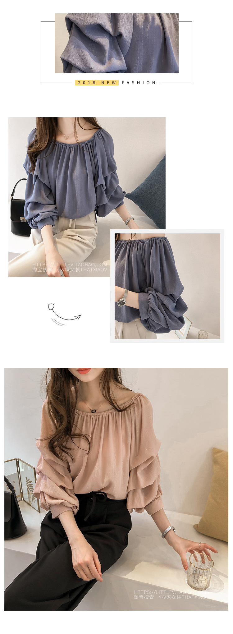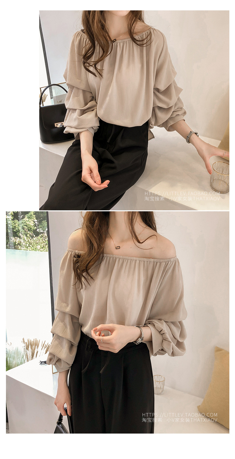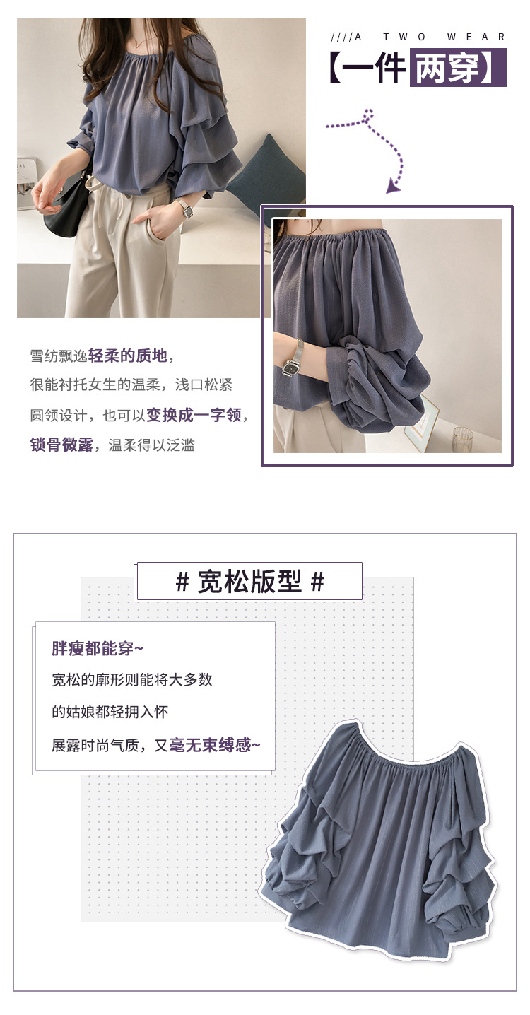 现货 夏季新款韩版一字领露肩宽松层层雪纺衫飘逸长袖上衣衬衫女