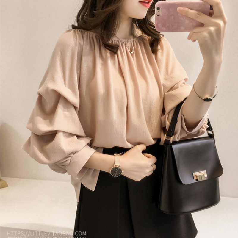 여름 새로운 한국 스타일 오픈 어깨 느슨한 레이어 쉬폰 셔츠 여성의 우아한 긴 소매 탑스토어 가기