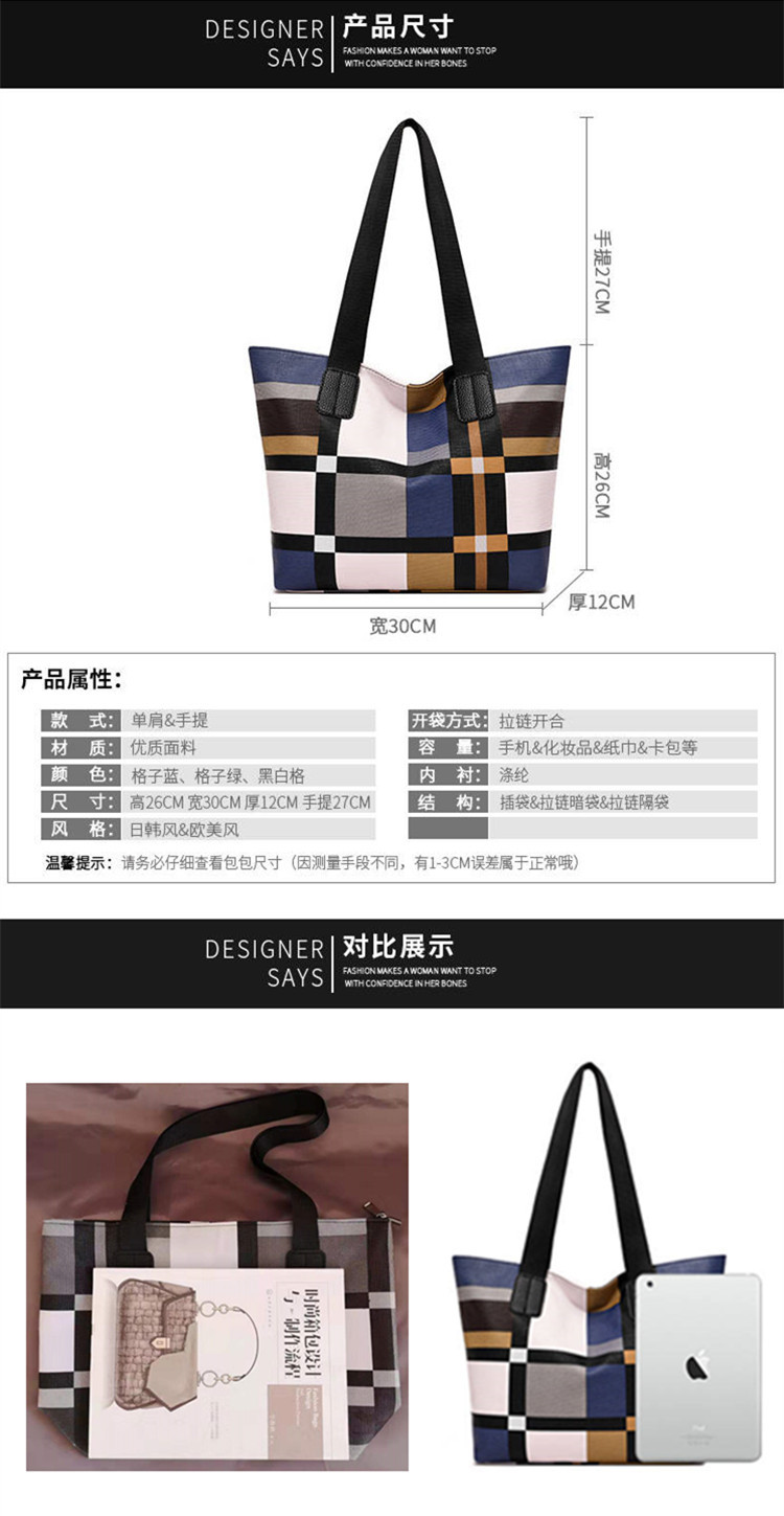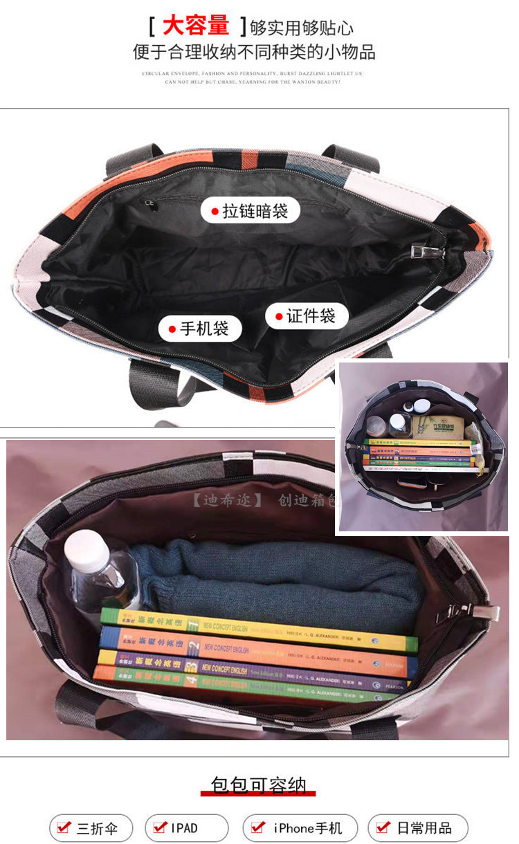 국경 간 인기 판매 토트 백 패션 숄더백 대용량 핸드백 대외 무역 여성 가방 통근 가방 체크 무늬 대형 가방 여성용스토어 가기