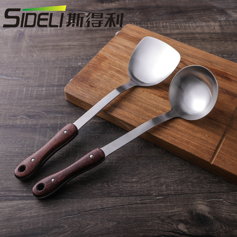 나무 손잡이 스테인레스 스틸 주걱 수프 스푼 가정용 주방 용품 세트 스케일 방지 요리 주걱 요리 스푼 주걱 주방 용품스토어 가기