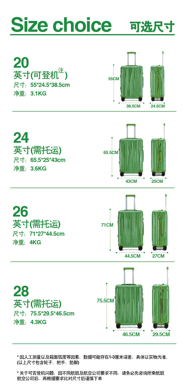 以上测量高度不包括轮子、拉杆、把手,测量方式不同,存在误差,仅供参考!