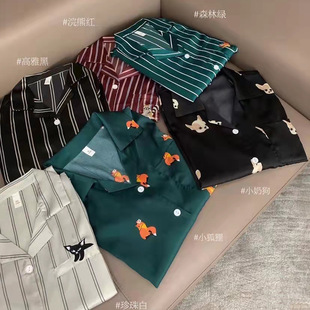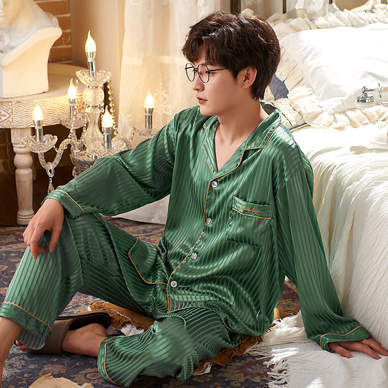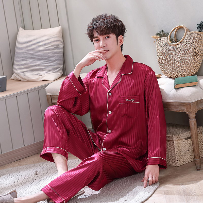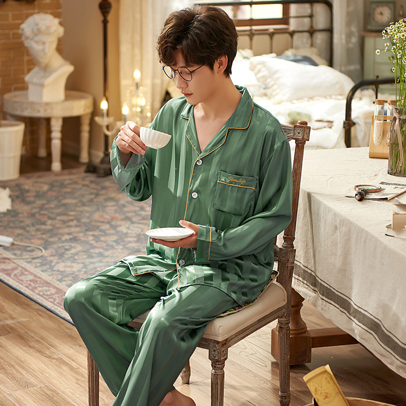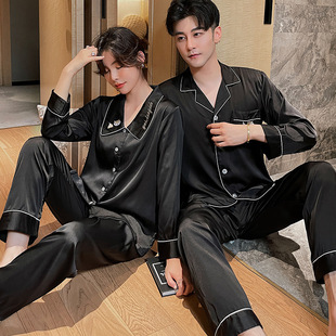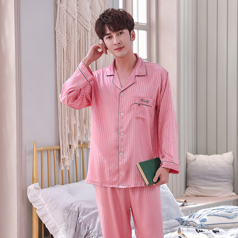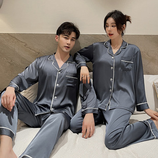 아이스 실크 커플 잠옷 여자의 봄과 여름 모조 실크 긴 소매 카디건 스트라이프 세트 남자의 플러스 사이즈 가정 옷 얇은스토어 가기