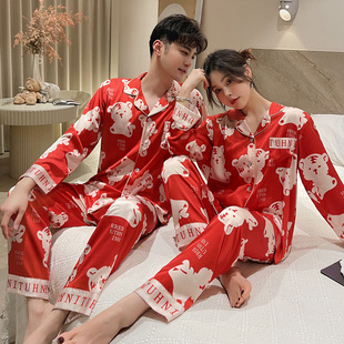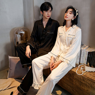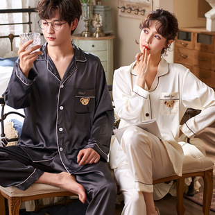 아이스 실크 커플 잠옷 여자의 봄과 여름 모조 실크 긴 소매 카디건 스트라이프 세트 남자의 플러스 사이즈 가정 옷 얇은