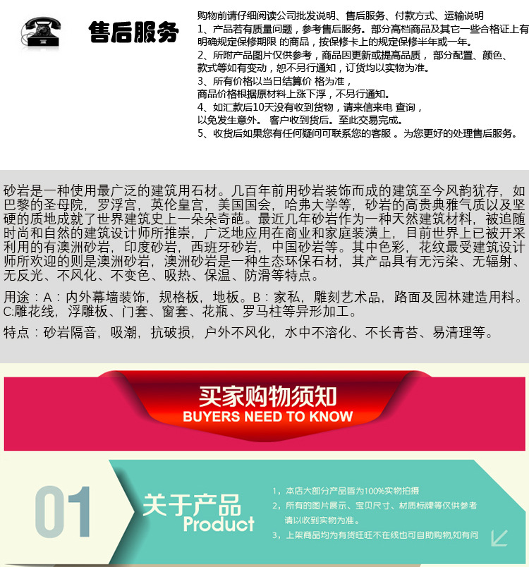 【产品描述】:砂岩是一种沉积岩,是由石粒经过水冲蚀沉淀于河床上,经千百年的堆积变得坚固而成。后因地球造山运动,而形成今日的矿山。 砂岩是一种亚光石材,不会产生因光反射而引起的光污染,又是一种天然的防滑材料。而大理石、花岗石是光面石材,只有光才显示装饰效果,容易产生光污染。 砂岩是零放射性石材,对人体无伤害,并且可惜吸取周围的有害气体,从装饰风格来说,砂岩创造一种暖色调的风格,显素雅、温馨,又不失华贵大气。在耐用性上,砂岩则绝对可以比拟大理石、花岗石,它不会风化,不会变色。许多在一二百年前,用砂岩建成的建筑至今风采依旧,风韵犹存。