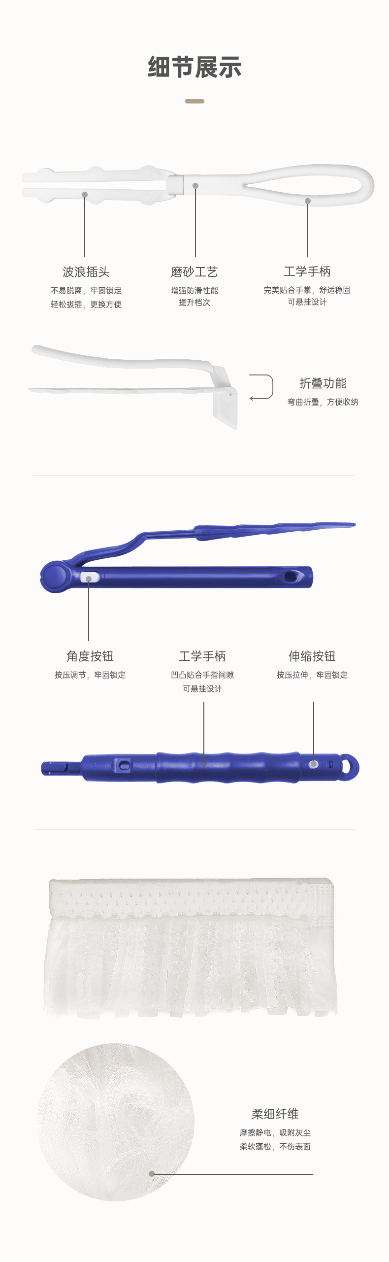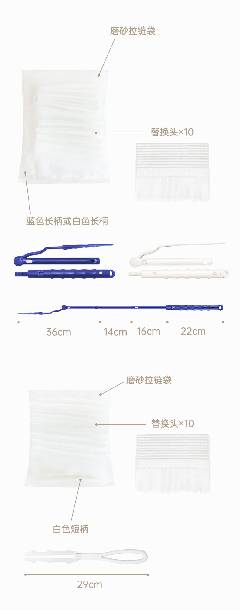 • 흰색 먼지떨이 머리 10 개 + 파란색 긴 손잡이 1 개