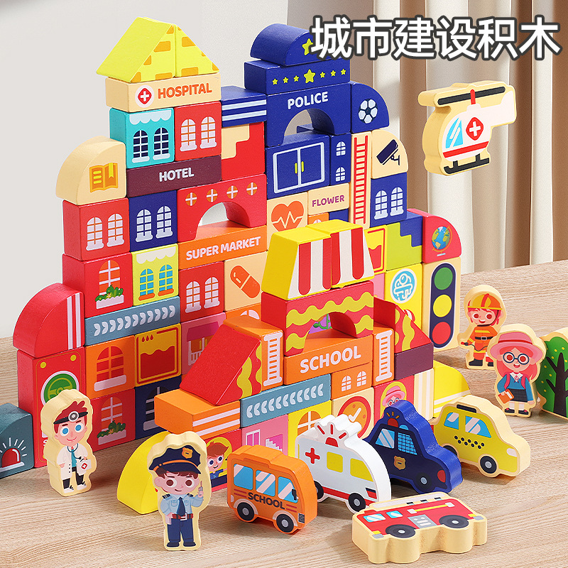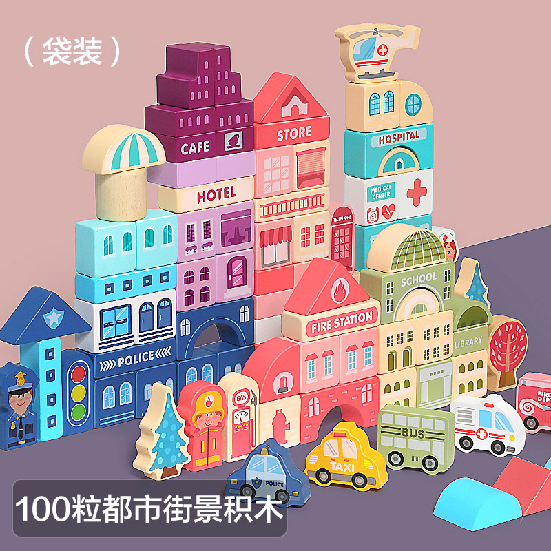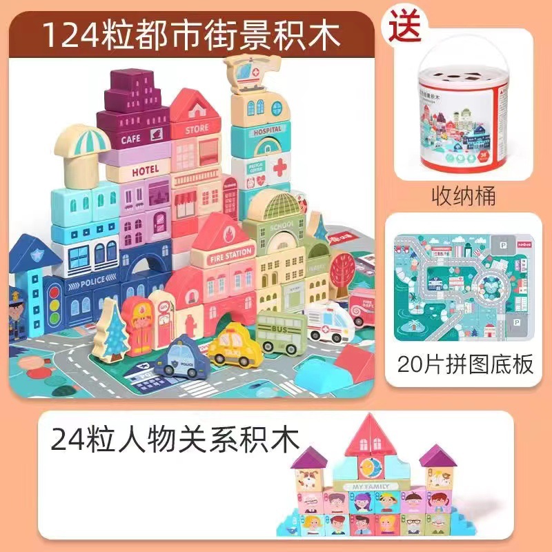 Cpc 어린이 목조 빌딩 블록 도시 거리 풍경 다채로운 캐릭터 동물 자동차 대형 입자 빌딩 블록 배럴 장난감스토어 가기