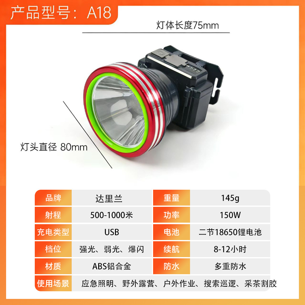• A18-150W 대형 헤드 초고휘도 모델 [충전 케이블, 머리끈 증정] 최대 14시간 사용 가능