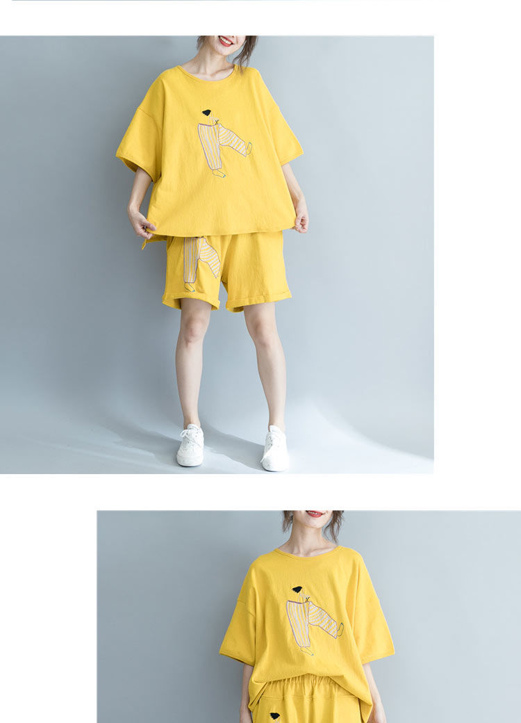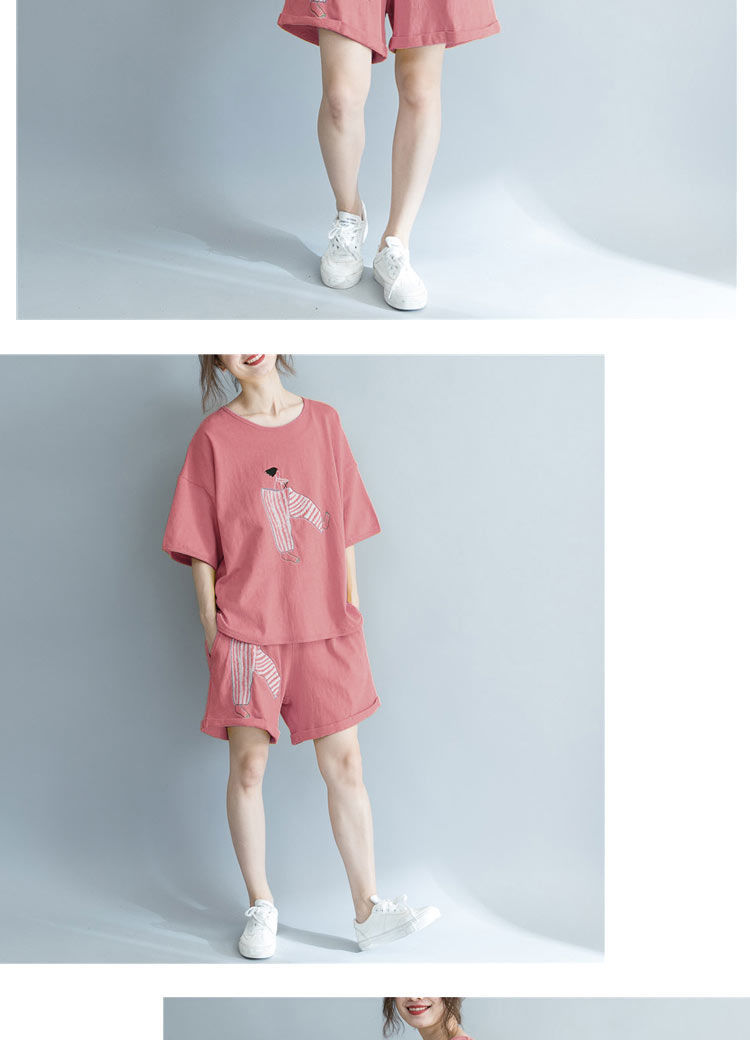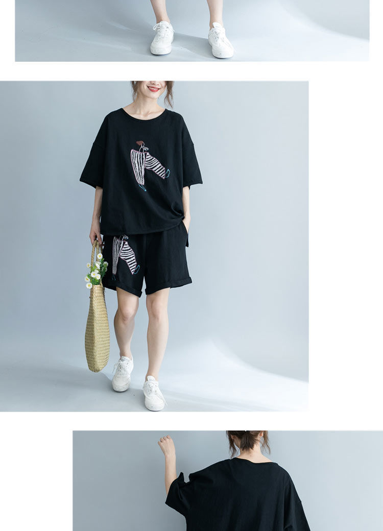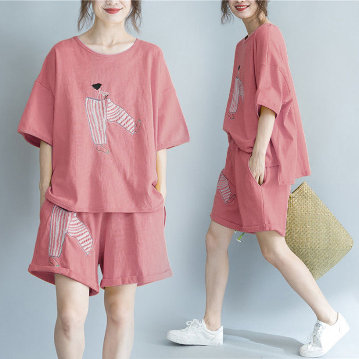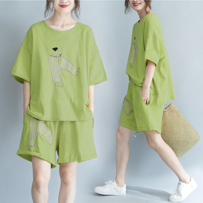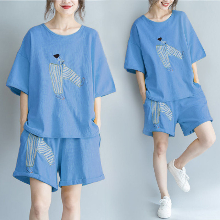 큰 사이즈 바지 세트 여름 새로운 크로스보더 여성용 반팔 티셔츠 루즈한 와이드 레그 반바지 캐주얼 통통녀 투피스 세트