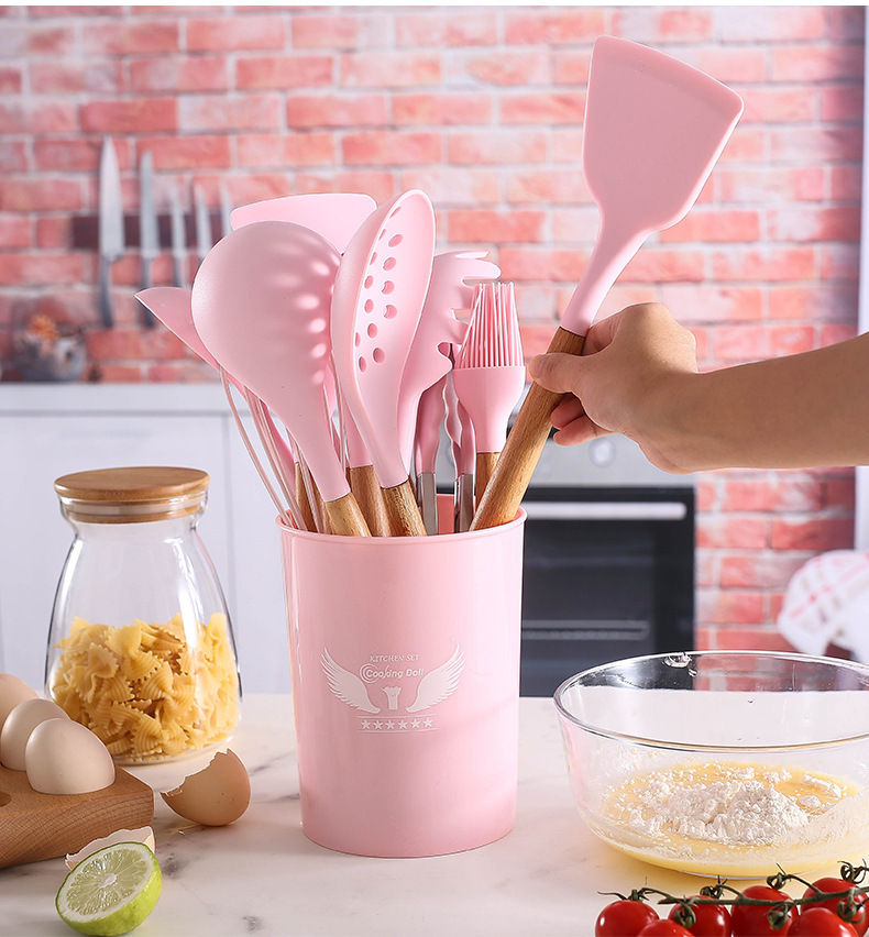 • 木柄不粘锅锅铲饭勺汤勺粉爪刮铲收纳桶12件硅胶厨具硅胶厨房用具