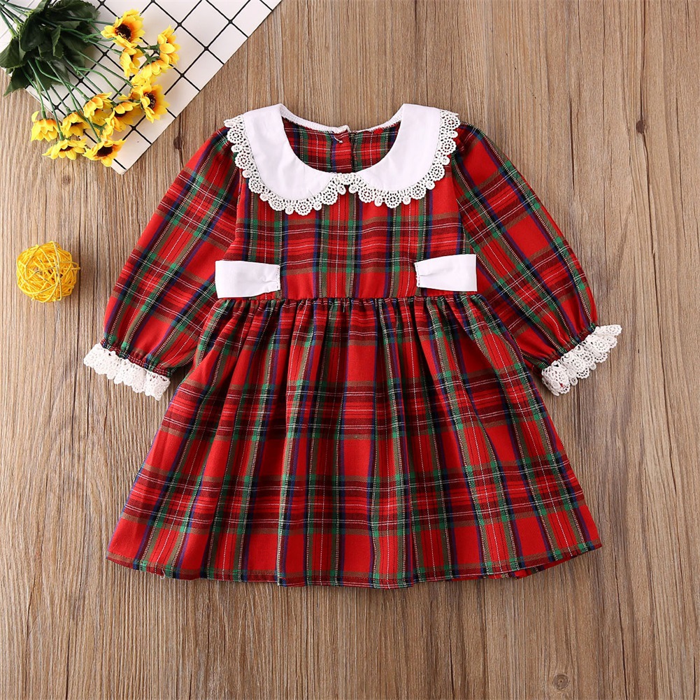 2023 유럽과 미국의 새로운 크로스 보더 소녀 크리스마스 레이스 크루넥 레이스 긴 소매 서양 스타일 격자 무늬 원피스 어린이스토어 가기