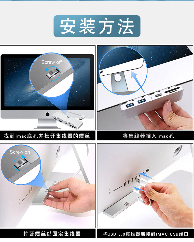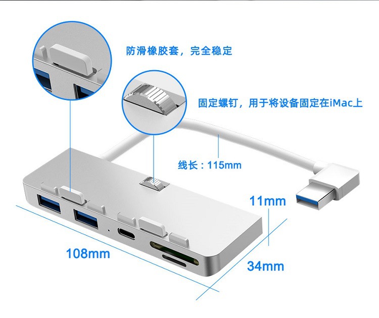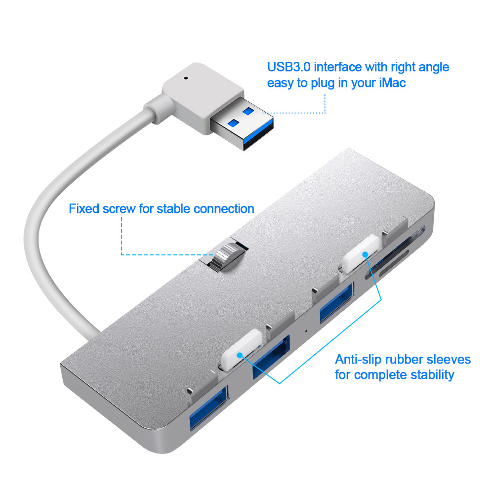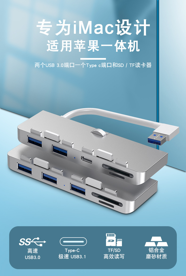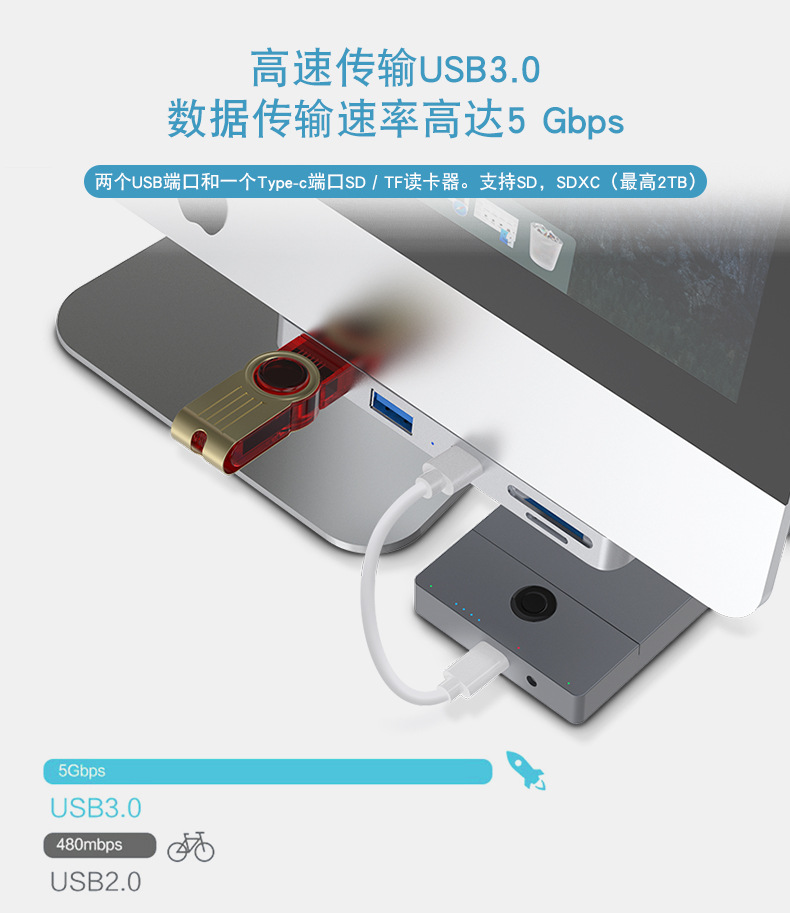 具有SD / TF读卡器组合的Rocketek超薄优质铝制3端口USB 3.0集线器专为iMac设计。它将三个USB 3.0端口和SD / TF读卡器插槽添加到iMac的正面。不再需要扭转电缆以垂直到达端口。现在,您可以以符合人体工程学的角度轻松访问USB端口和额外的2个插槽读卡器!它不需要任何软件或复杂的安装过程。采用纤薄设计,为您节省宝贵的桌面空间。