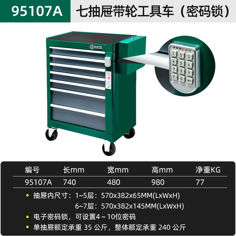 • 95107A 7단 서랍 비밀번호 잠금 바퀴 달린 공구함 *없음*없음*없음