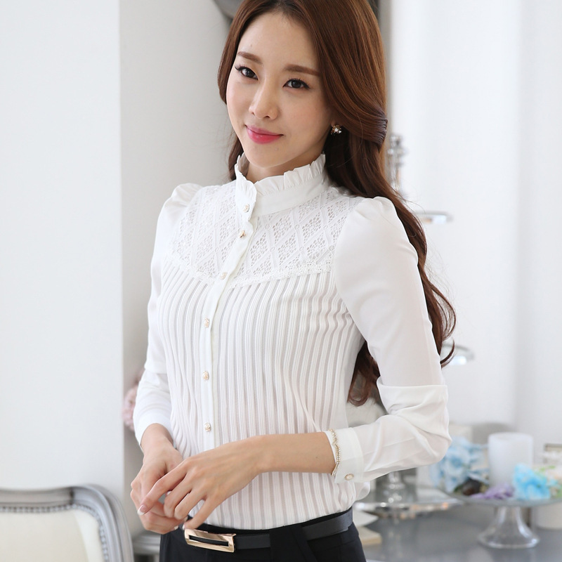 2025 봄 신상 셔츠 출퇴근복 한국 스타일 스탠드 칼라 레이스 쉬폰 이너웨어 전문직 슬림핏 긴팔 흰색 셔츠스토어 가기