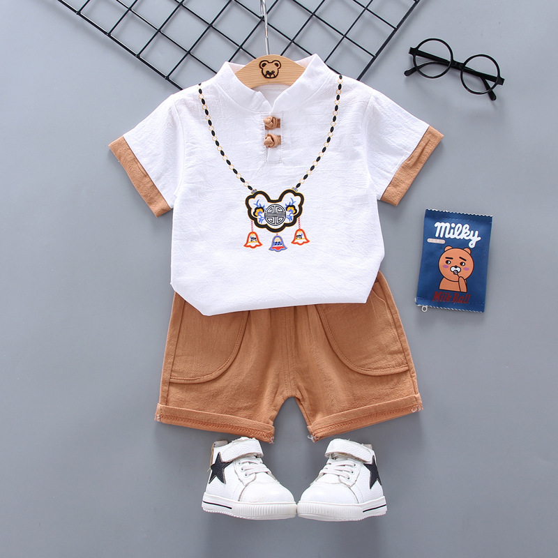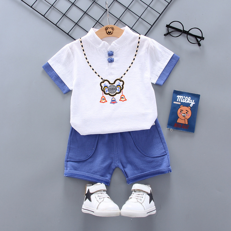 아동복 반팔 세트 2020 새로운 한국 스타일 면과 린넨 긴 수명 잠금 2 피스 반팔 티셔츠 반바지 여름용 캐주얼웨어