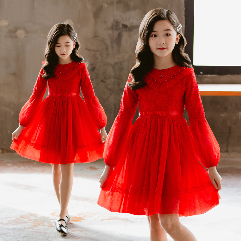 소녀 원피스 가을과 겨울 기모 레이스 공주 원피스 흰색 거즈 원피스 빨간색 성능 원피스 퍼프 소매 새로운스토어 가기