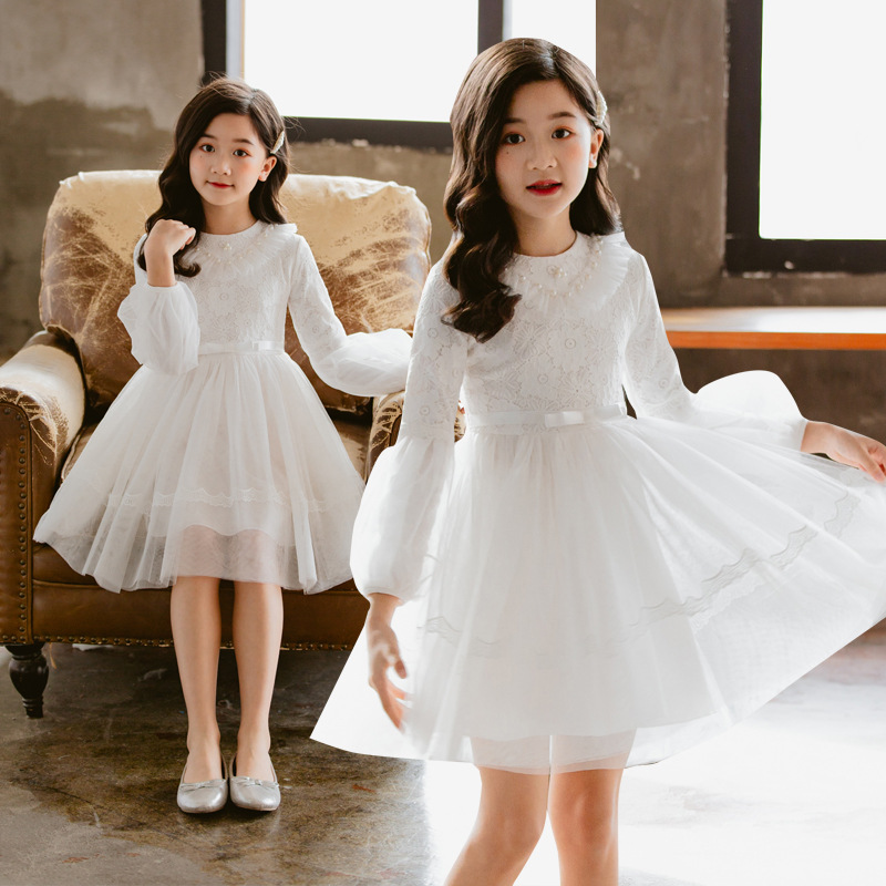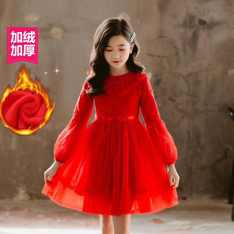 소녀 원피스 가을과 겨울 기모 레이스 공주 원피스 흰색 거즈 원피스 빨간색 성능 원피스 퍼프 소매 새로운