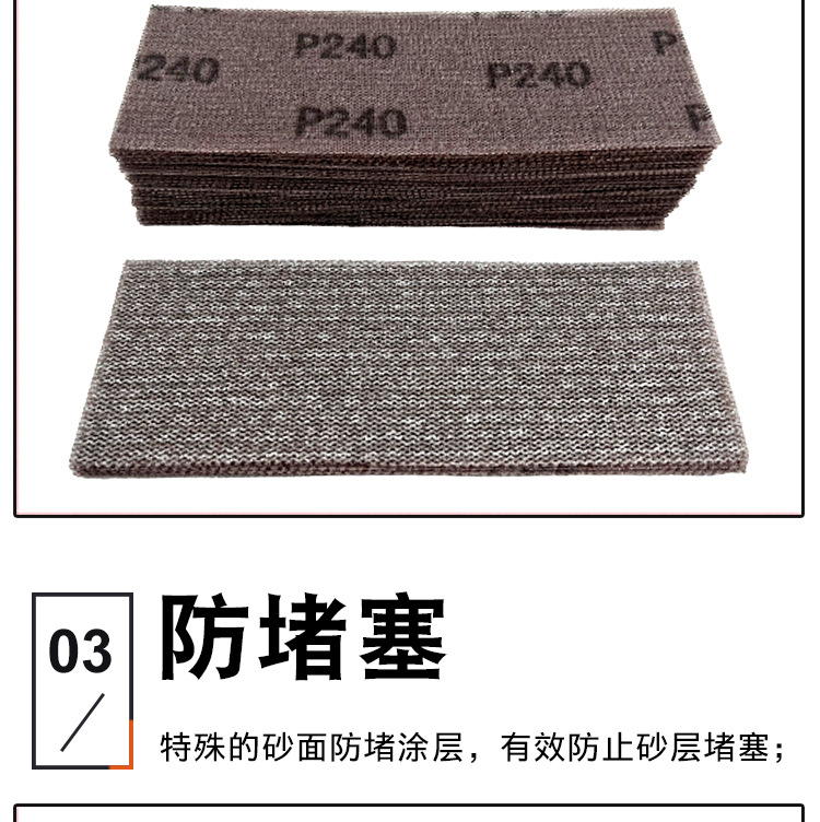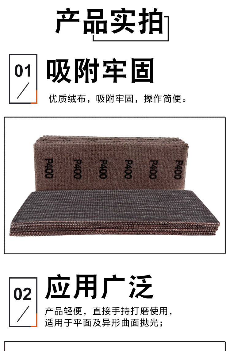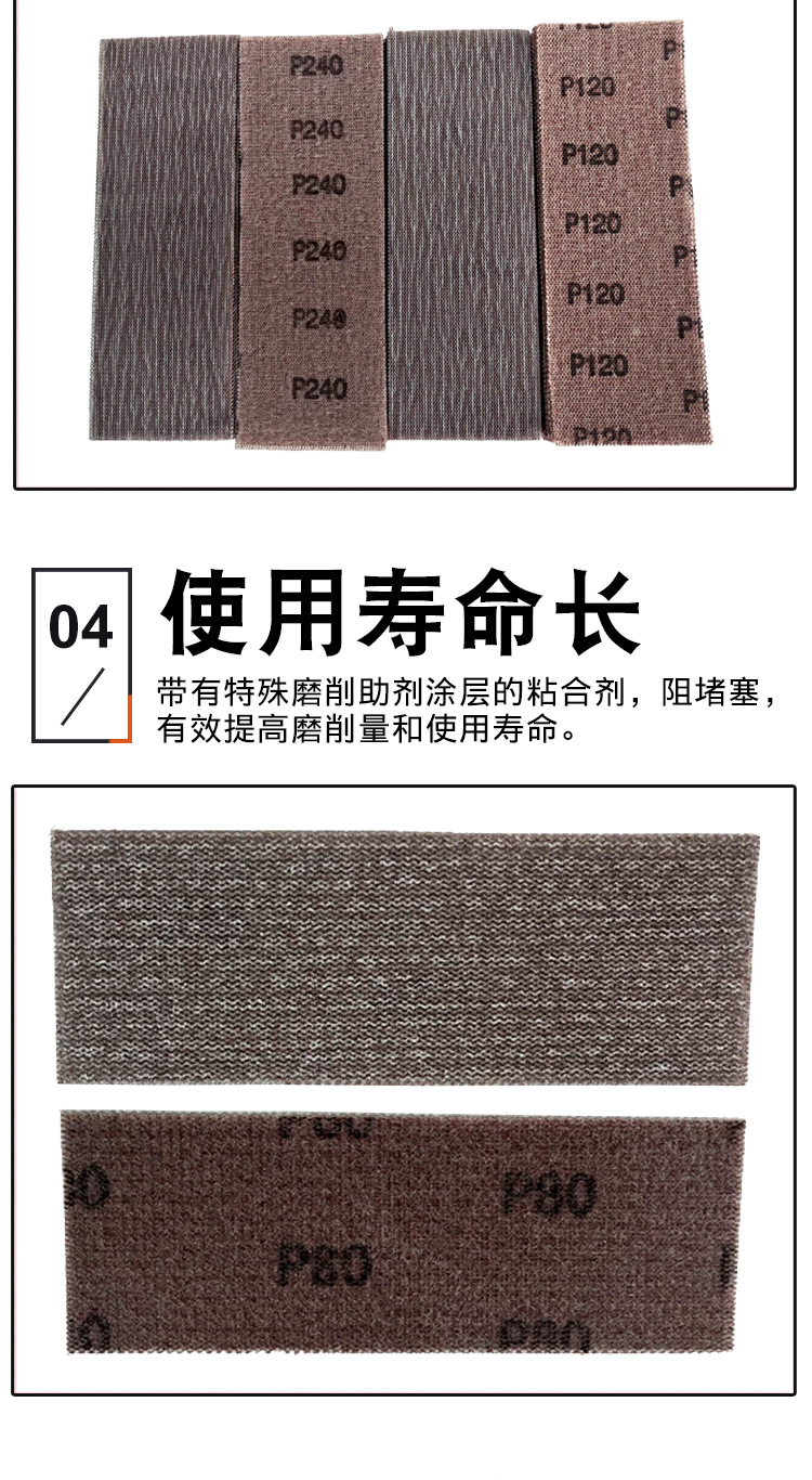 特点:1.具有网格状,强力打磨,研磨效率高,有效使用时间长,研磨物自动清理等优点。2.该产品的使用寿命是传统砂皮砂布的5-8倍,是传统砂皮、砂布的替代品。3.由于砂筛的开口设计并且两边都涂有研磨材料,它抗阻塞和砂筛的两面都有比其他磨料较长的寿命。所有的这些因素保护环境并易于使用。