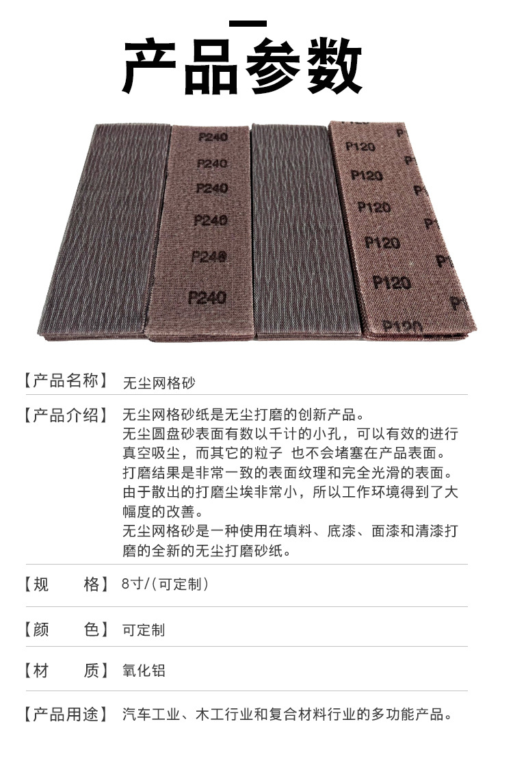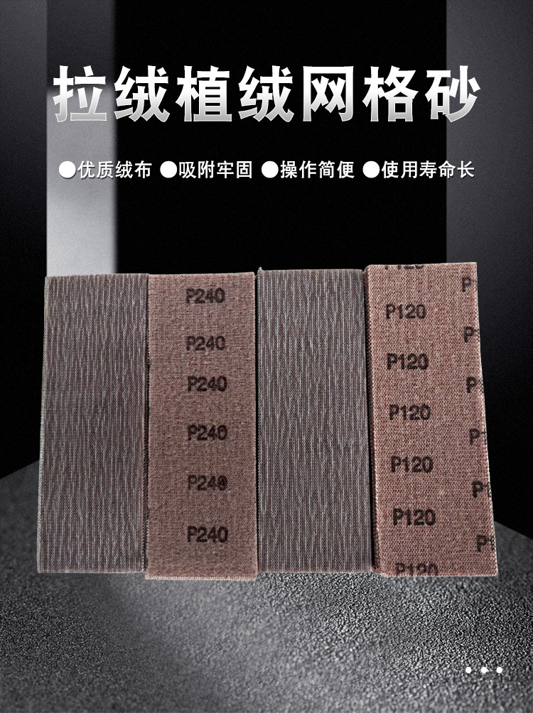 用途:网格砂不但适用于磨削石膏和墙面,而且适用于磨削金属材料的锈斑,而且也用于研磨和抛光。