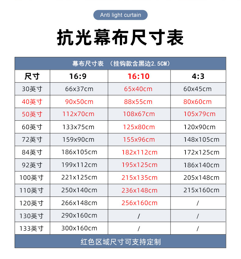 幕布尺寸表供为参考:由于手工测量尺寸且每生产批次不同,可能会有1-3CM左右的误差,还请见谅!请以收到的实物为准!