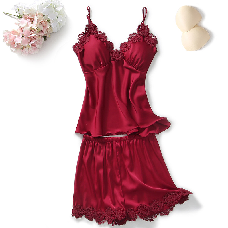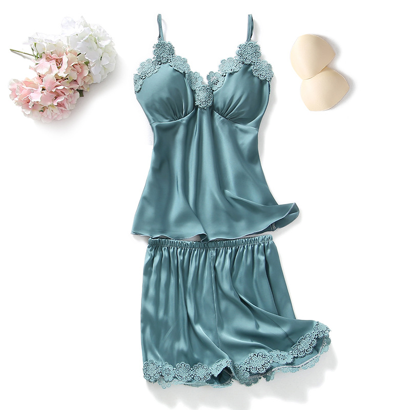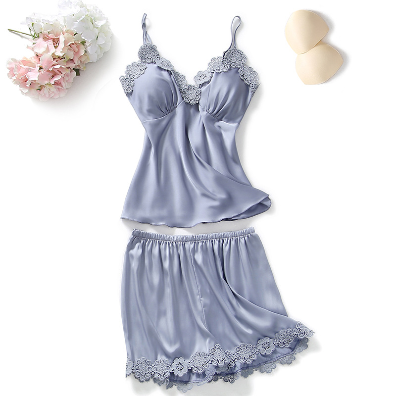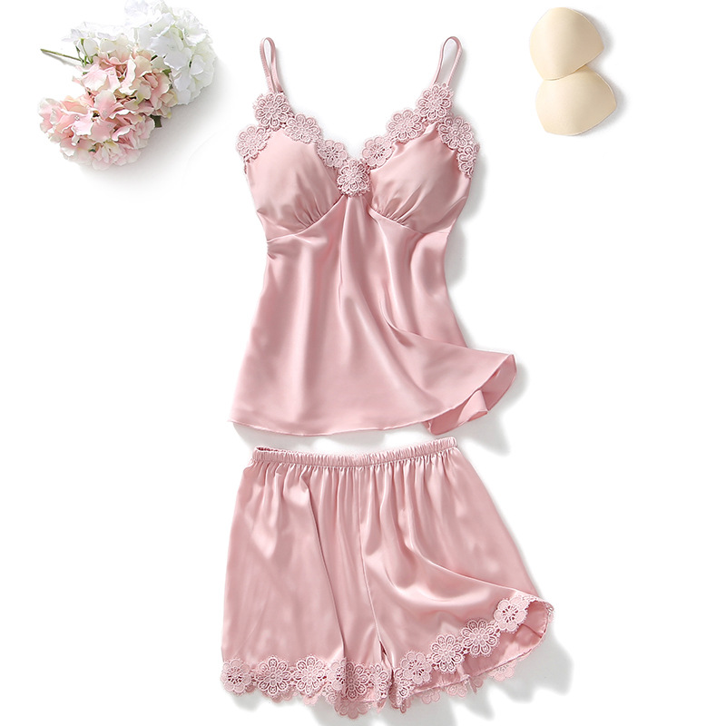 봄과 여름 새로운 실크 잠옷 여성용 꽃 레이스 섹시한 멜빵 반바지 2 피스 한국 귀여운 가정 옷스토어 가기