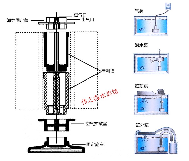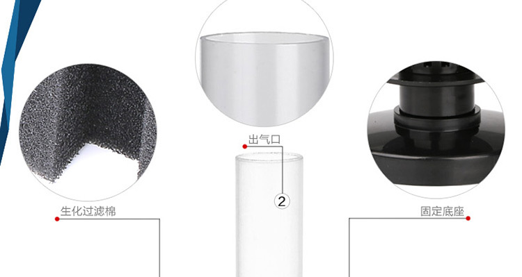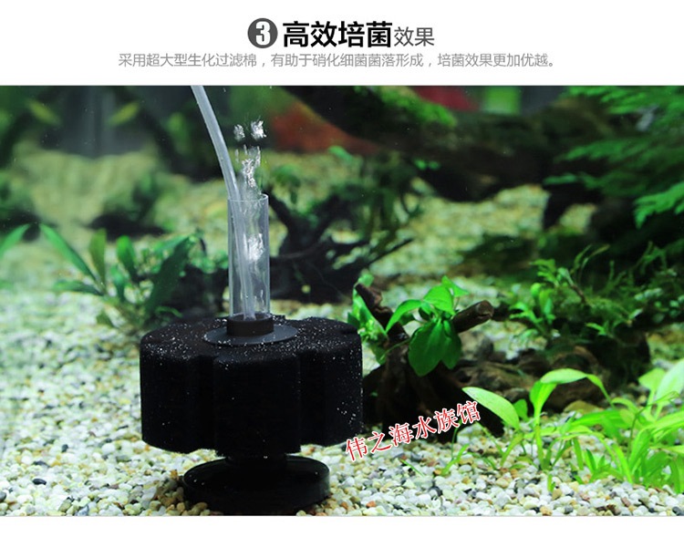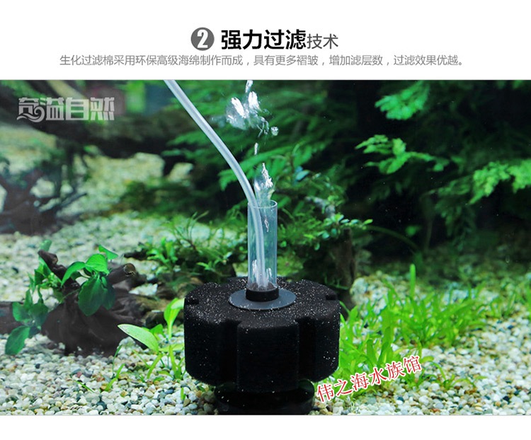 本产品采用环保的高级海棉作为滤材,使用时将气泵(须另行购买)出气孔接入本品进气口即