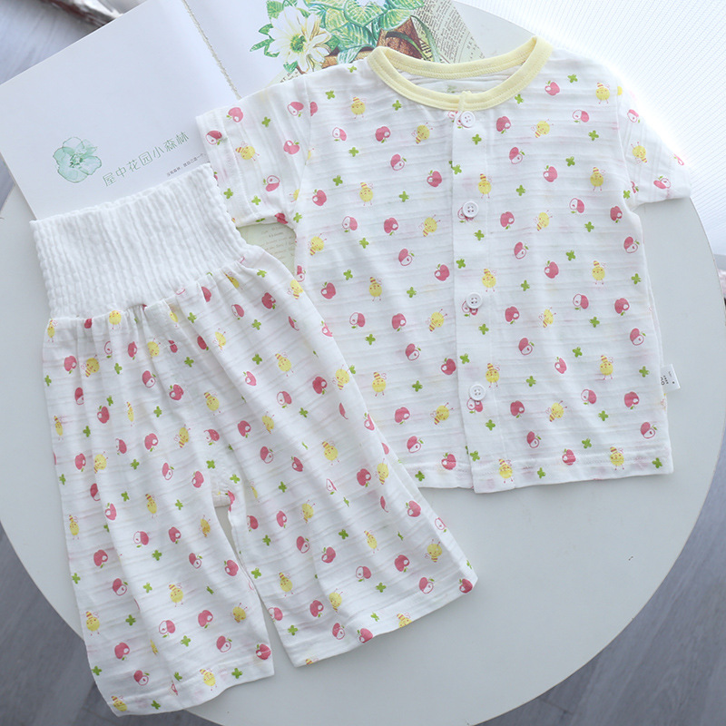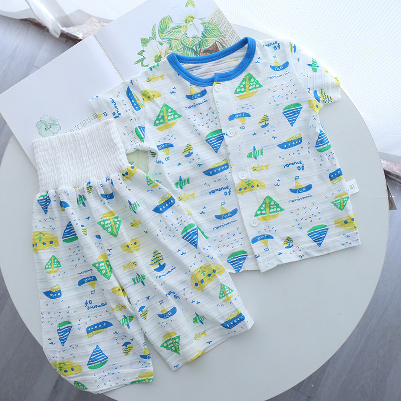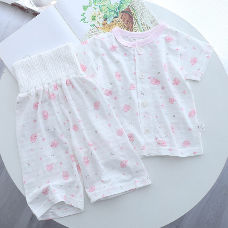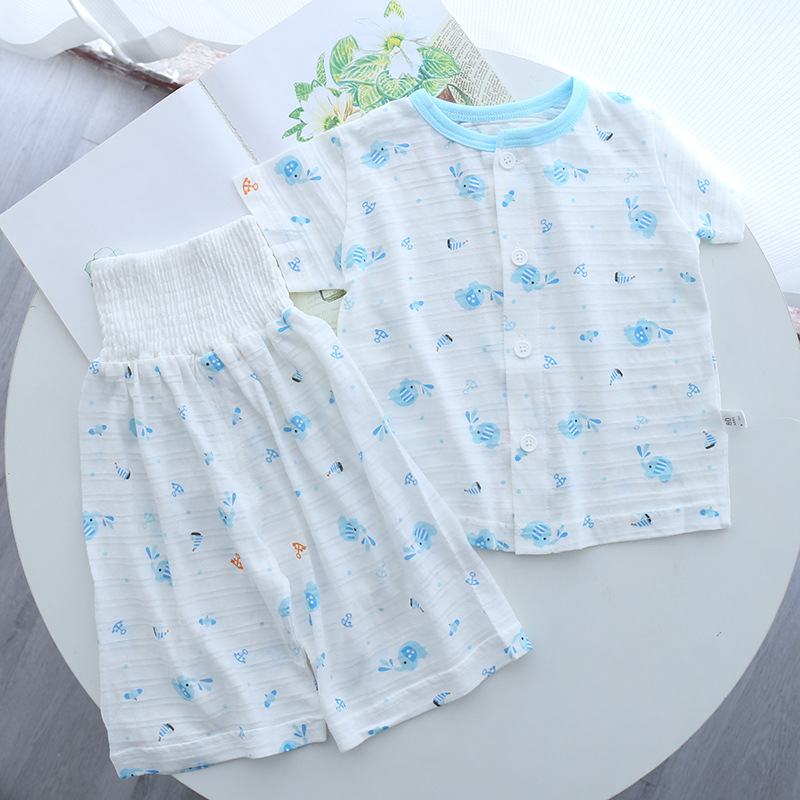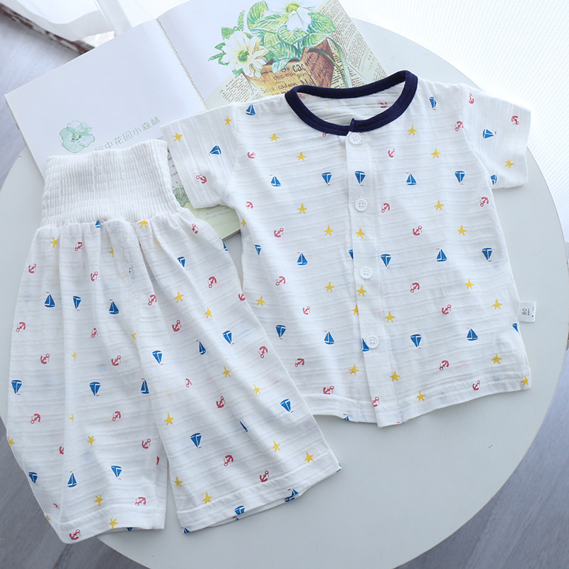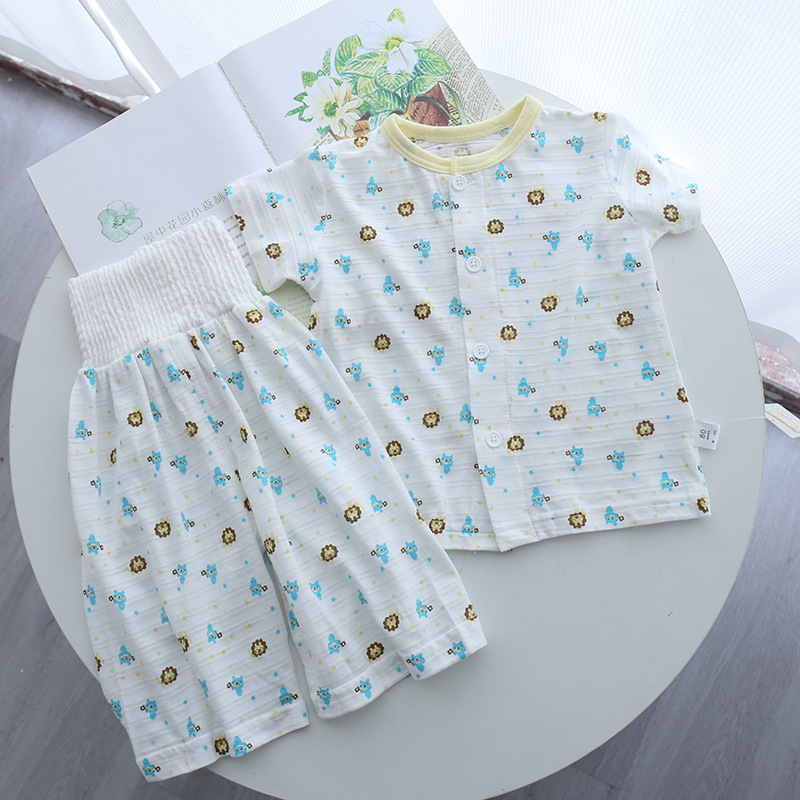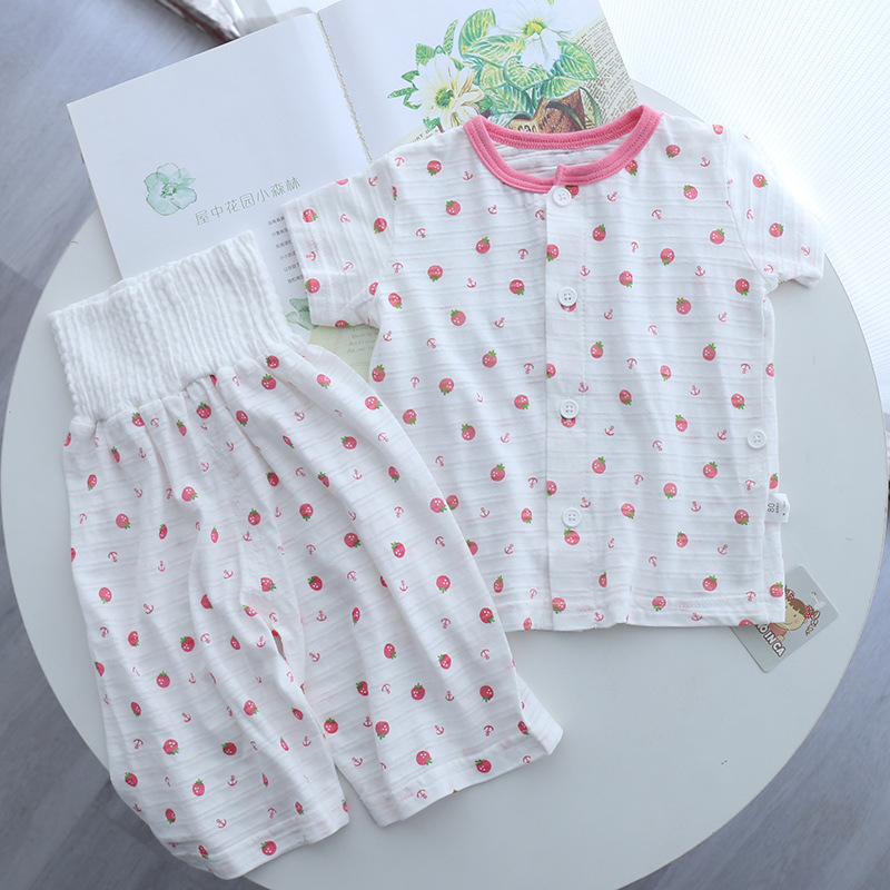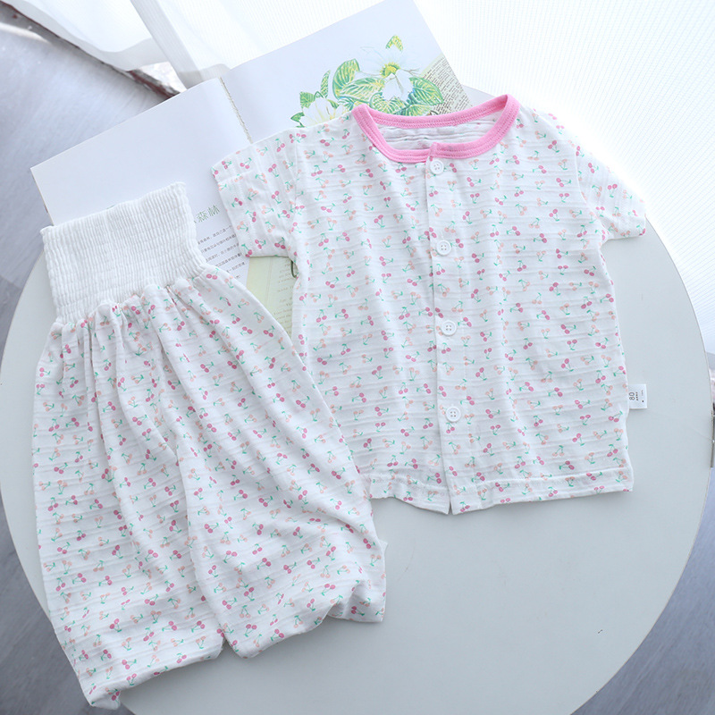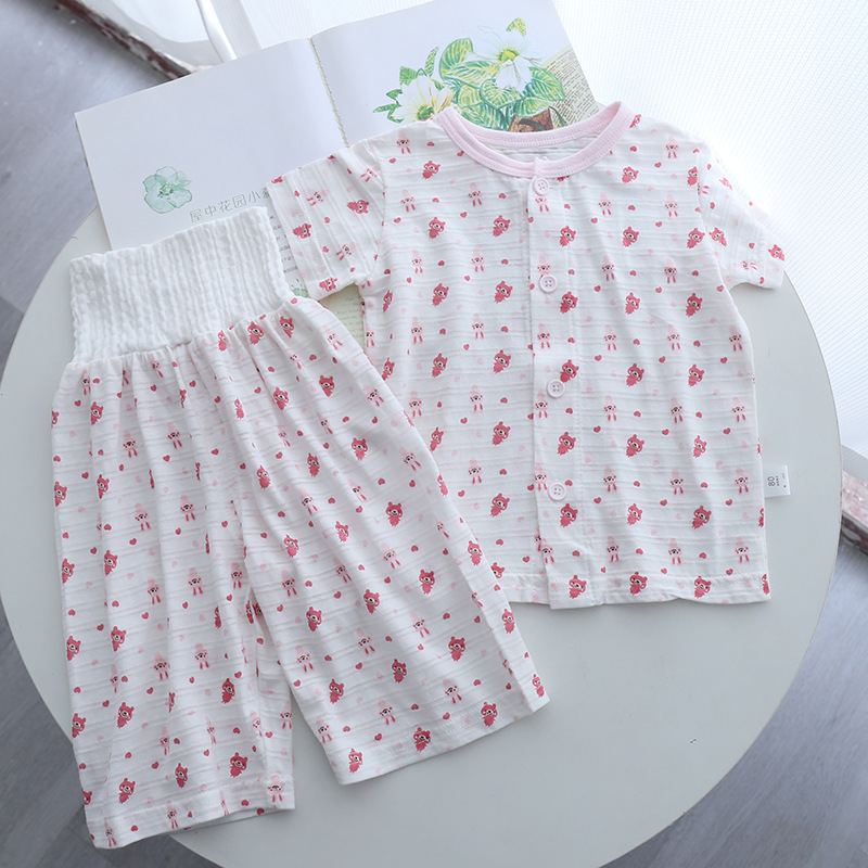 일본 스타일 여름 순면 얇은 어린이 가정 옷 버클 앞 짧은 소매 배꼽 바지 세트 아기 잠옷