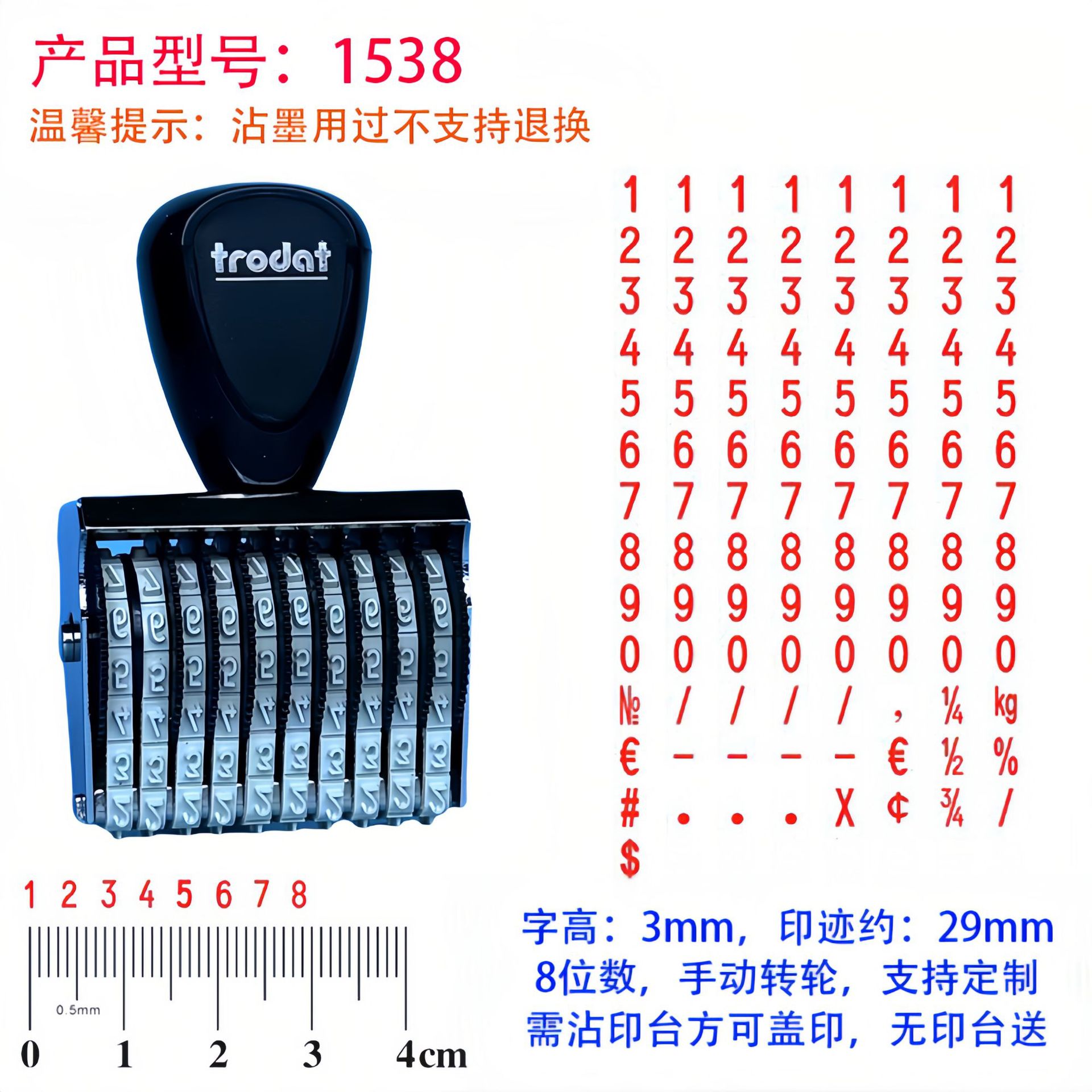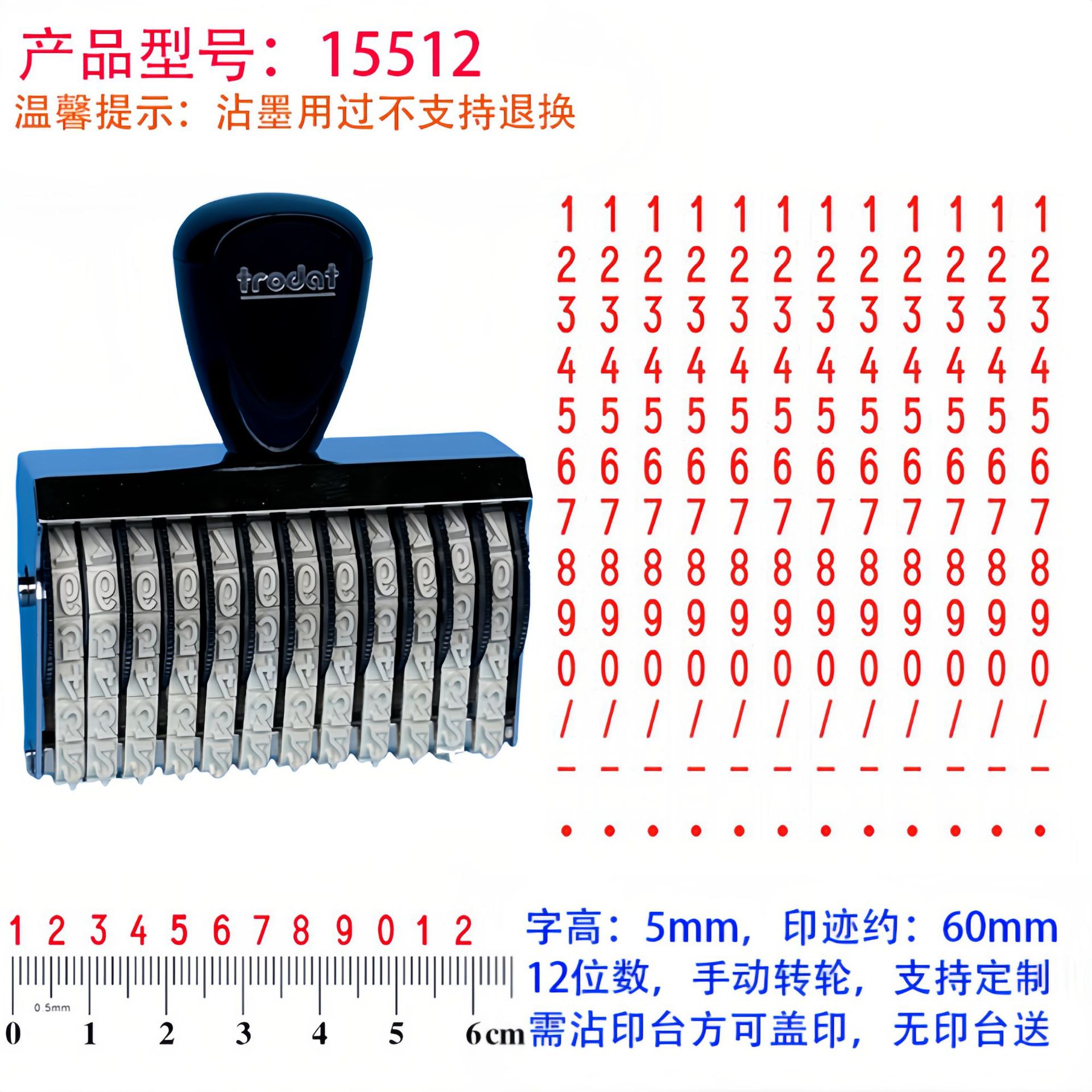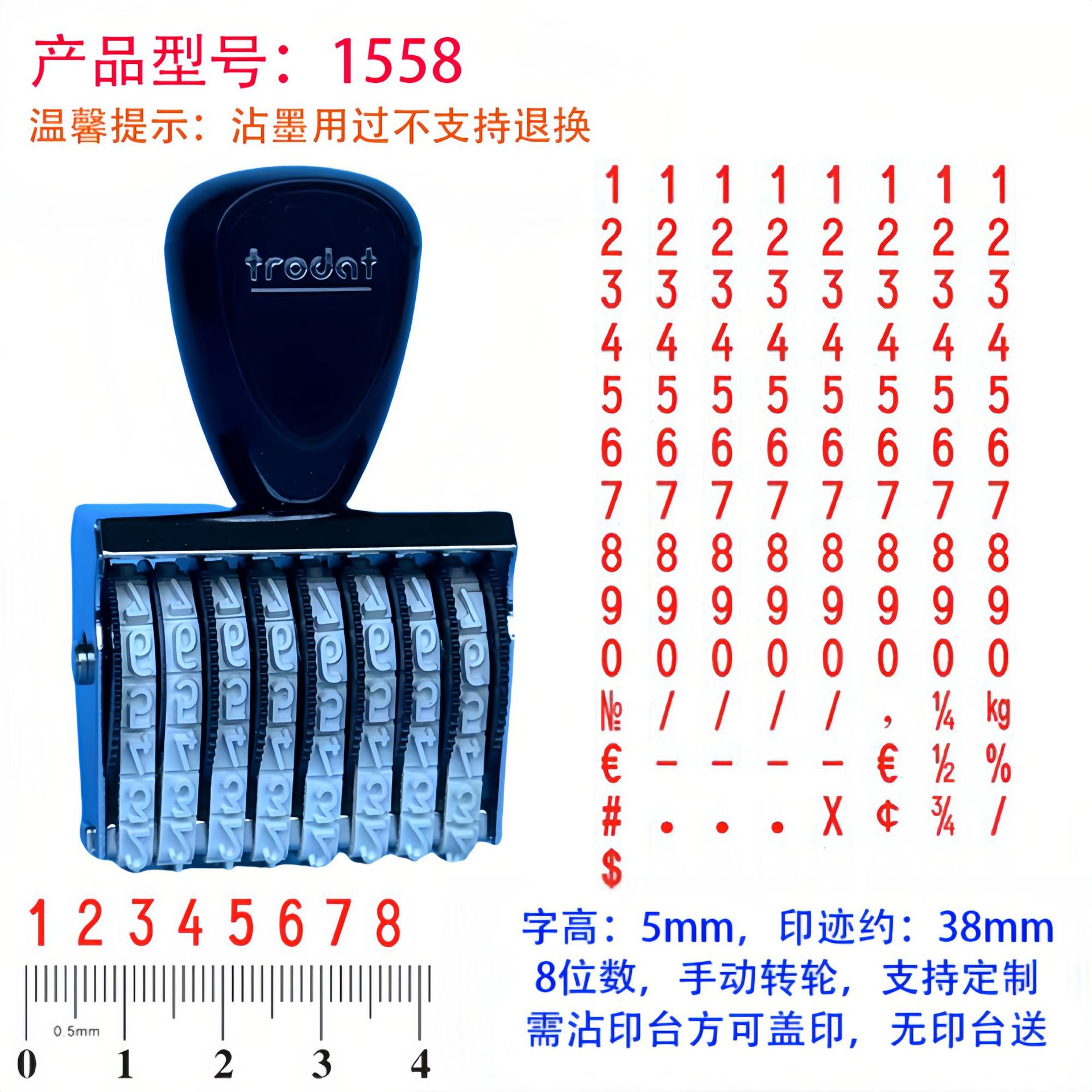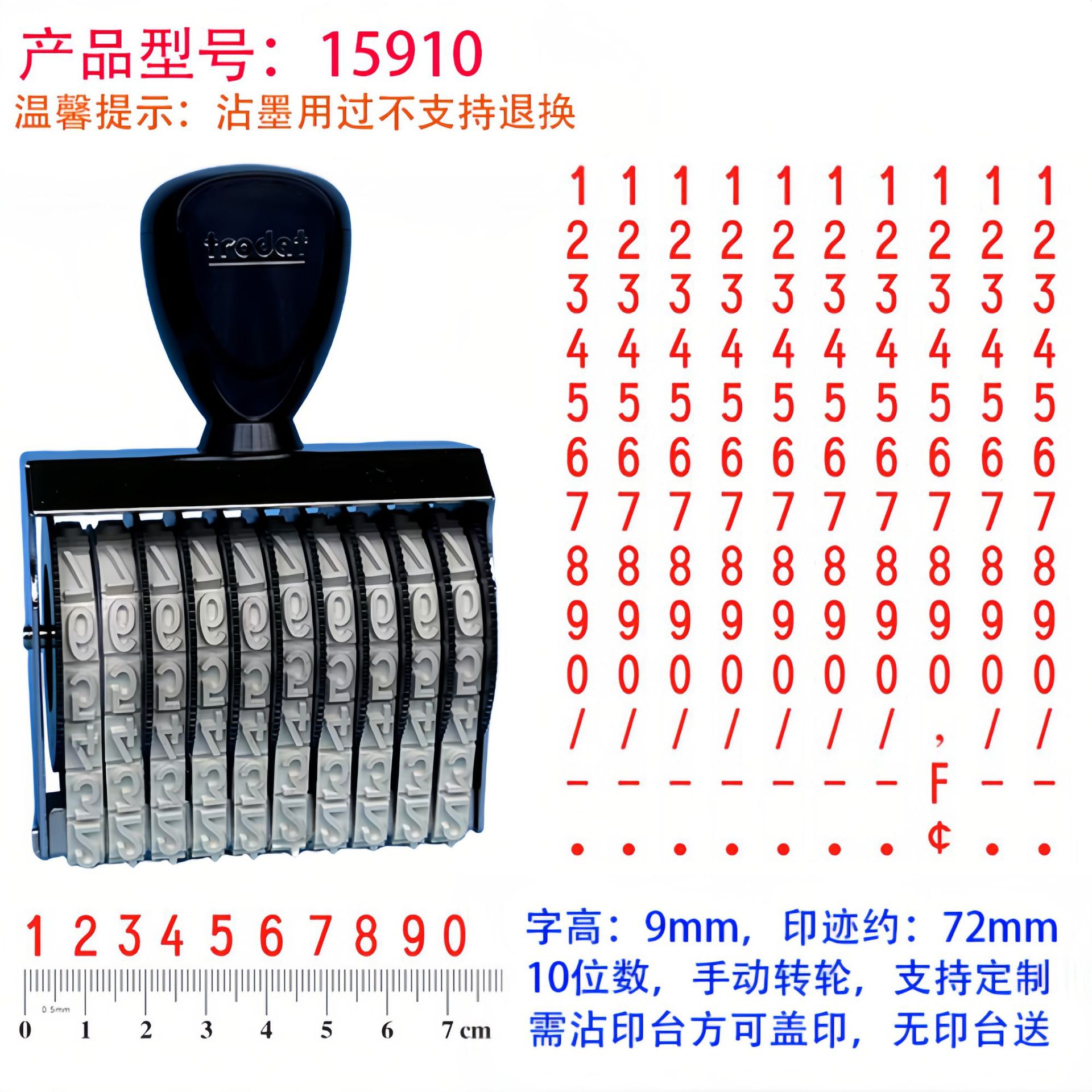 说明:  印章需手动调节转动,非自动跳号,需沾印台方可使用,此链接不含印台和印油,有需要印台和印油的请与客服联系