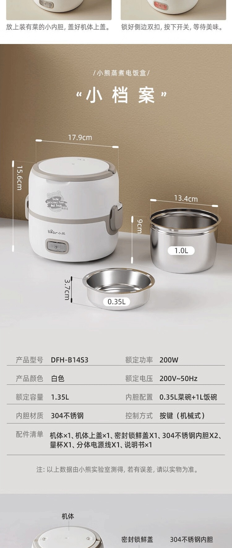 리틀베어 DFH-B14S3 전기 도시락 1.3L 가열 및 보온 기능, 스테인리스 내부, 가열 가능스토어 가기
