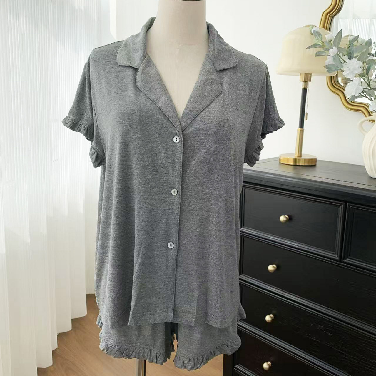 L:衣长 59 胸围 114 袖长 15 肩宽 46 裤长 26 臀围 114 立裆 32 腰围 68-98