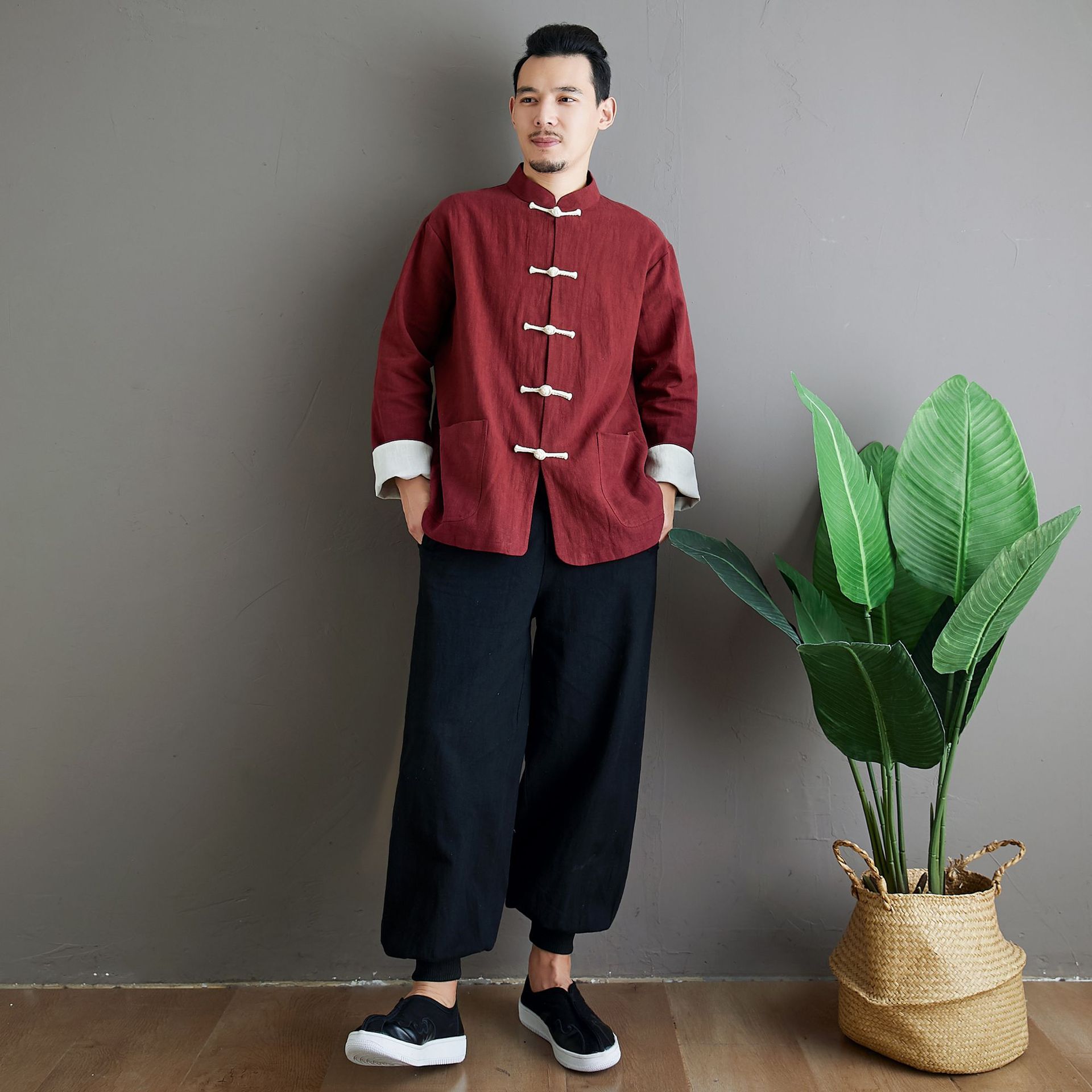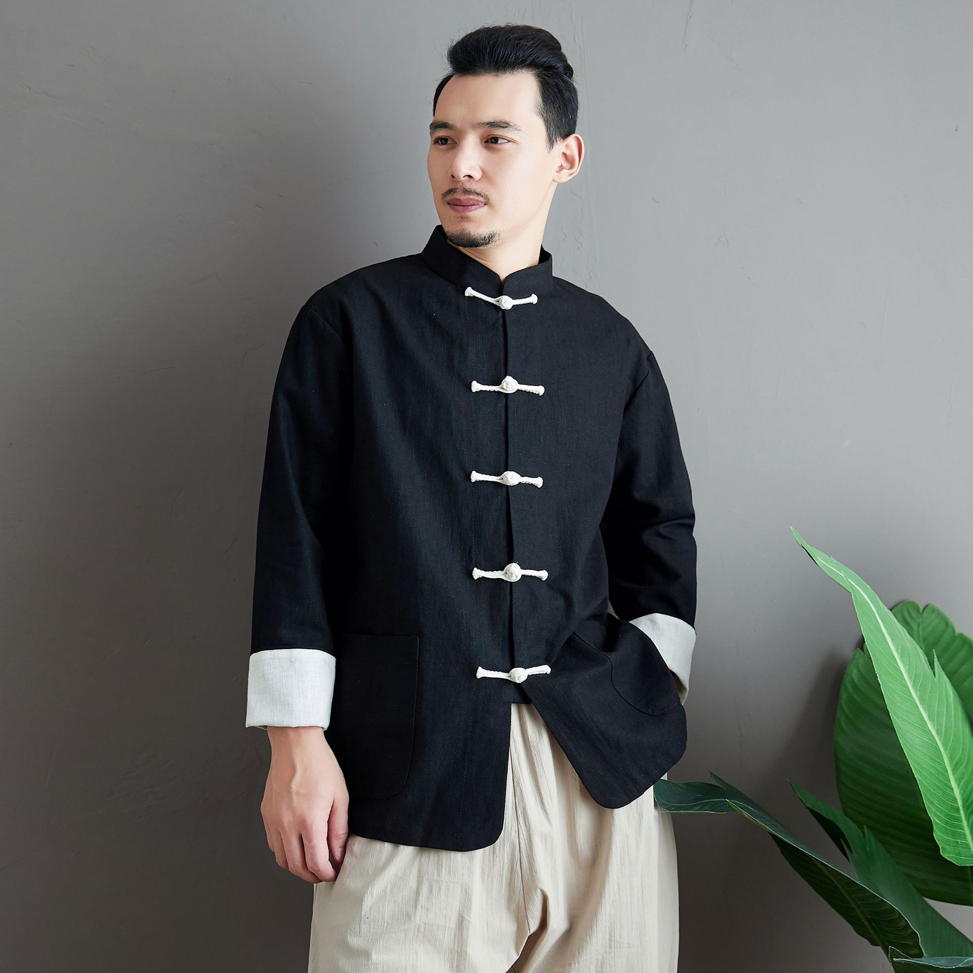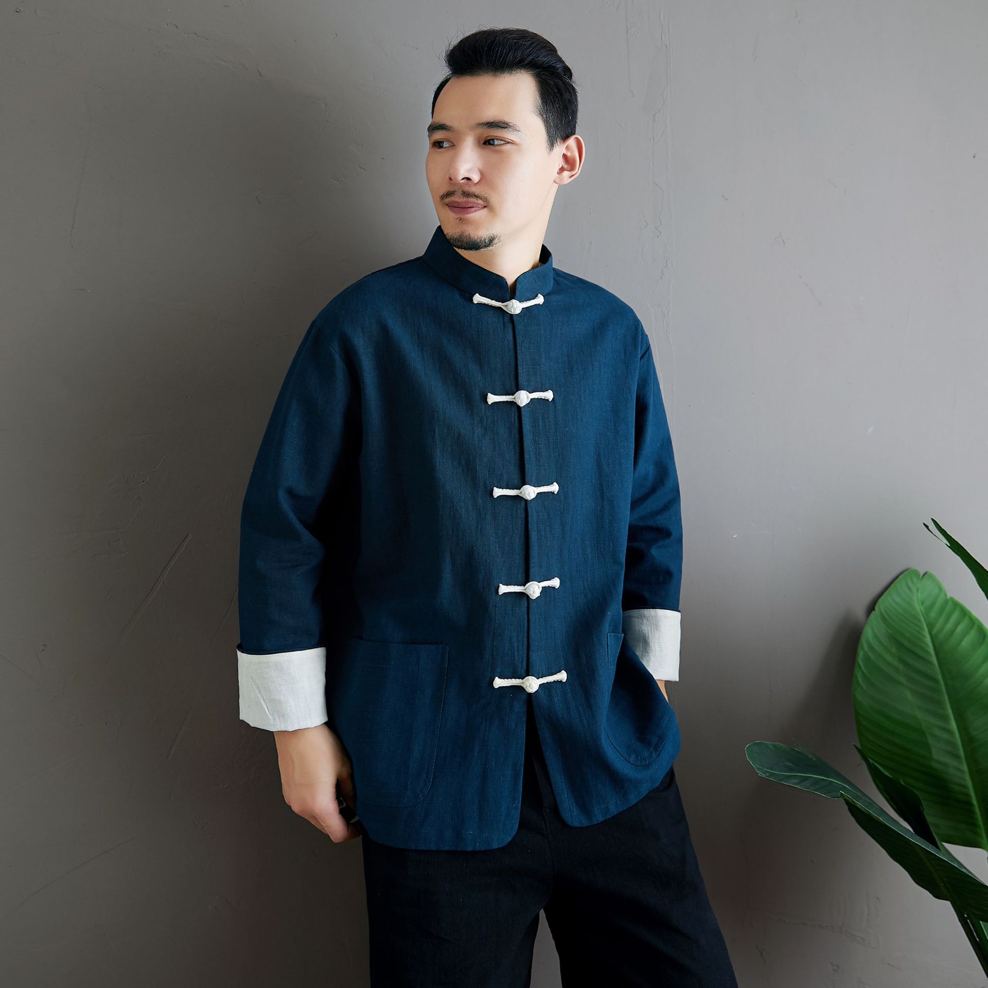 质地: 苎麻八支 袖口内部有留一圈白色衬 袖子可以卷起来留白,扣子和袖子采用白色撞色设计。