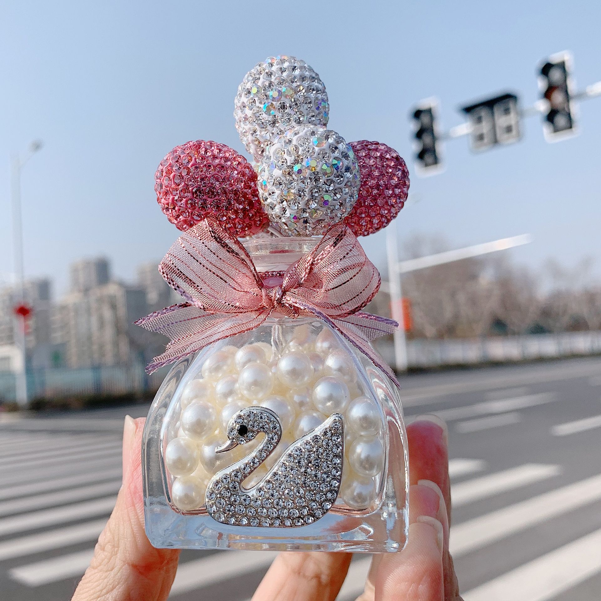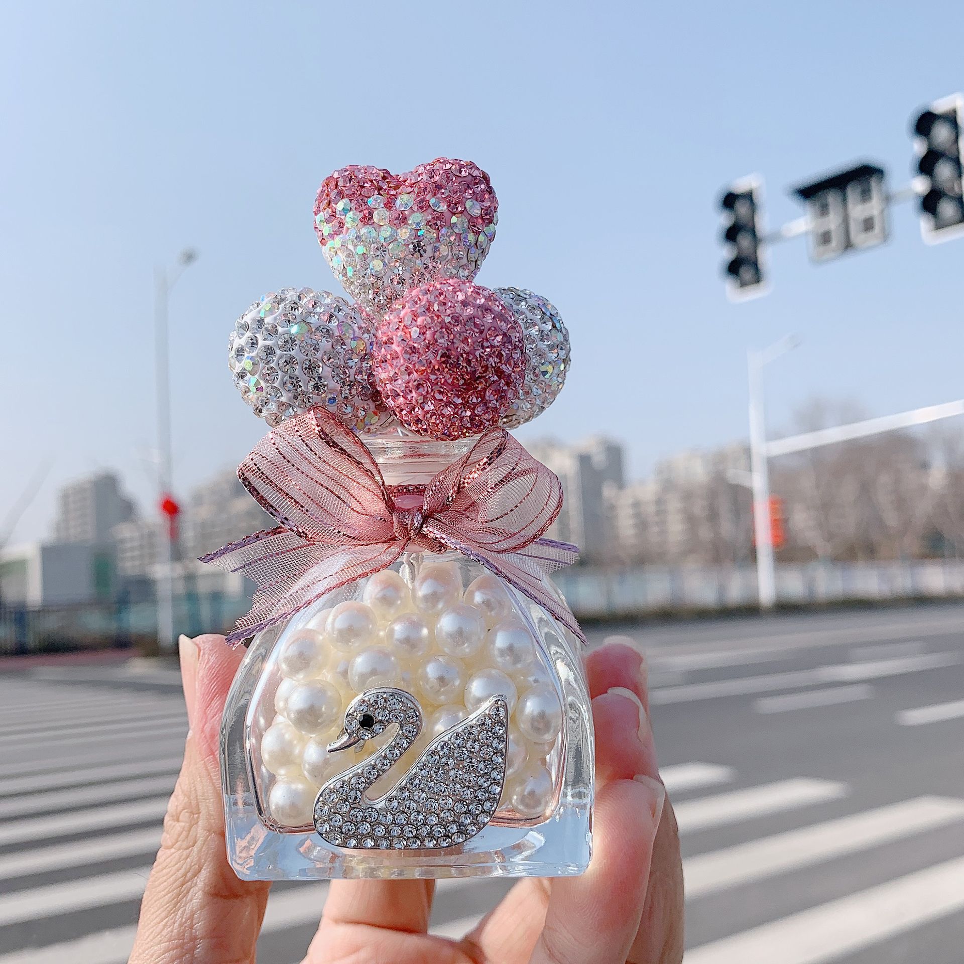 자동차 액세서리 모조 다이아몬드 백조 핑크 다이아몬드 광고 풍선 향수 병 자동차 상감 핑크 그라디언트 하트 모양의 자동차 장식품