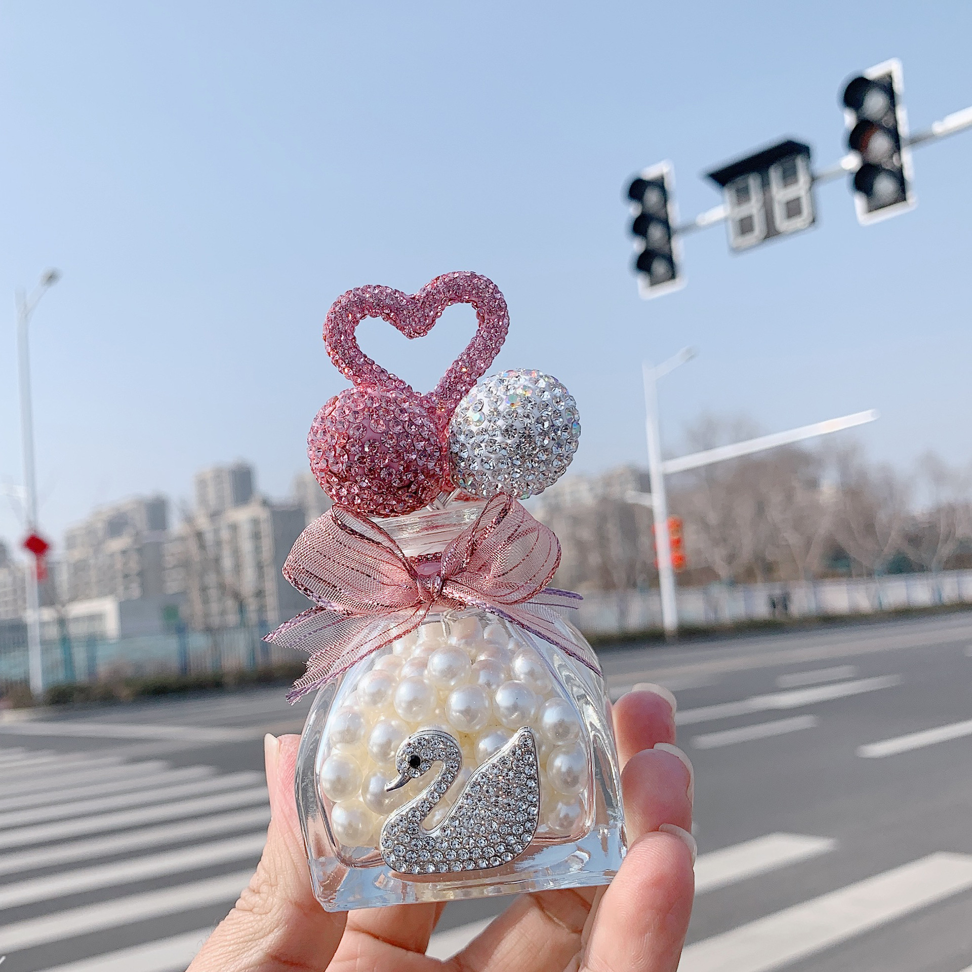 자동차 액세서리 모조 다이아몬드 백조 핑크 다이아몬드 광고 풍선 향수 병 자동차 상감 핑크 그라디언트 하트 모양의 자동차 장식품스토어 가기