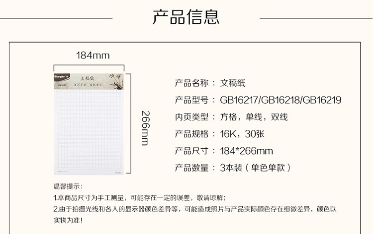 稿纸重量较重一箱120包=360本  31.7kg,尽量走物流  外箱体积55.5x38.5x21.5cm