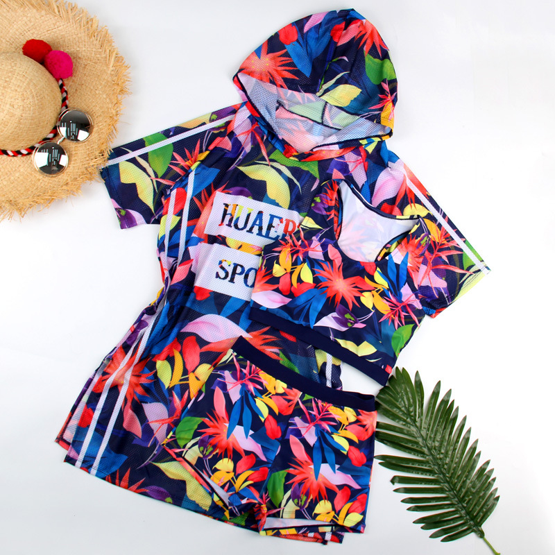 새로운 온천 스커트 분할 보수적 인 플랫 앵글 반팔 비키니 3 종 세트 배꼽 커버 슬리밍 플러스 사이즈 수영복 여성용