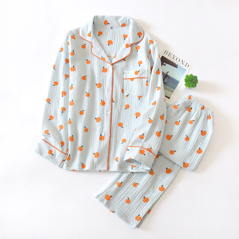 크레이프 작은 오렌지 프린트 여자의 홈 의류 니트 면 캐주얼 잠옷 여자의 긴 겉옷 잠옷 세트스토어 가기