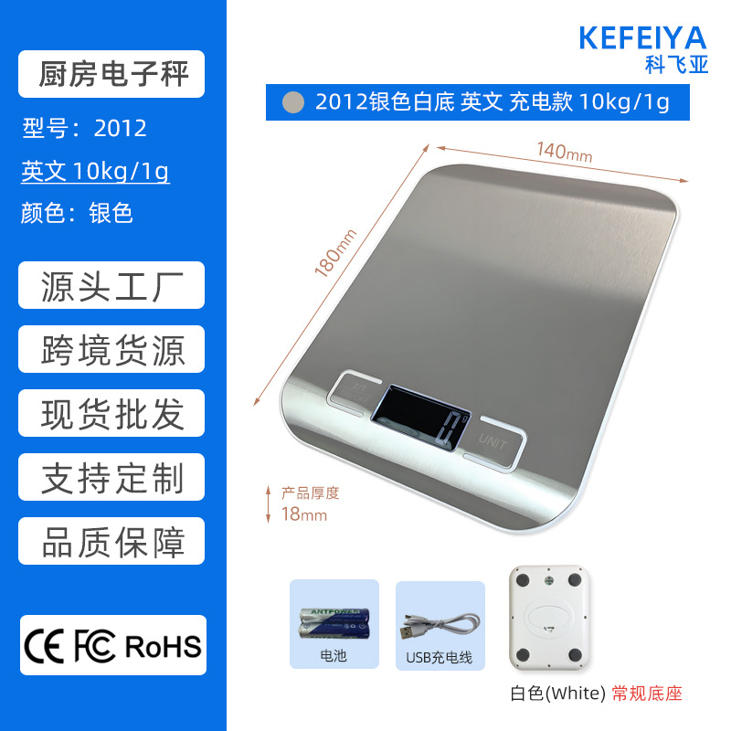 产品清单:电子秤、电池*2、珍珠棉内衬、PE袋、彩盒、说明书、充电线(充电款)