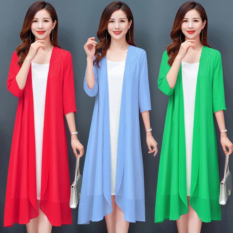 1223 중간 길이 쉬폰 선 스크린 여성용 무릎 길이 숄 가디건스토어 가기