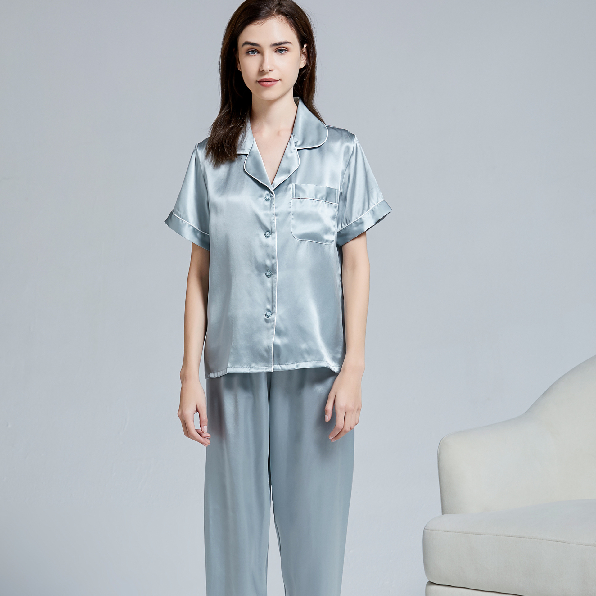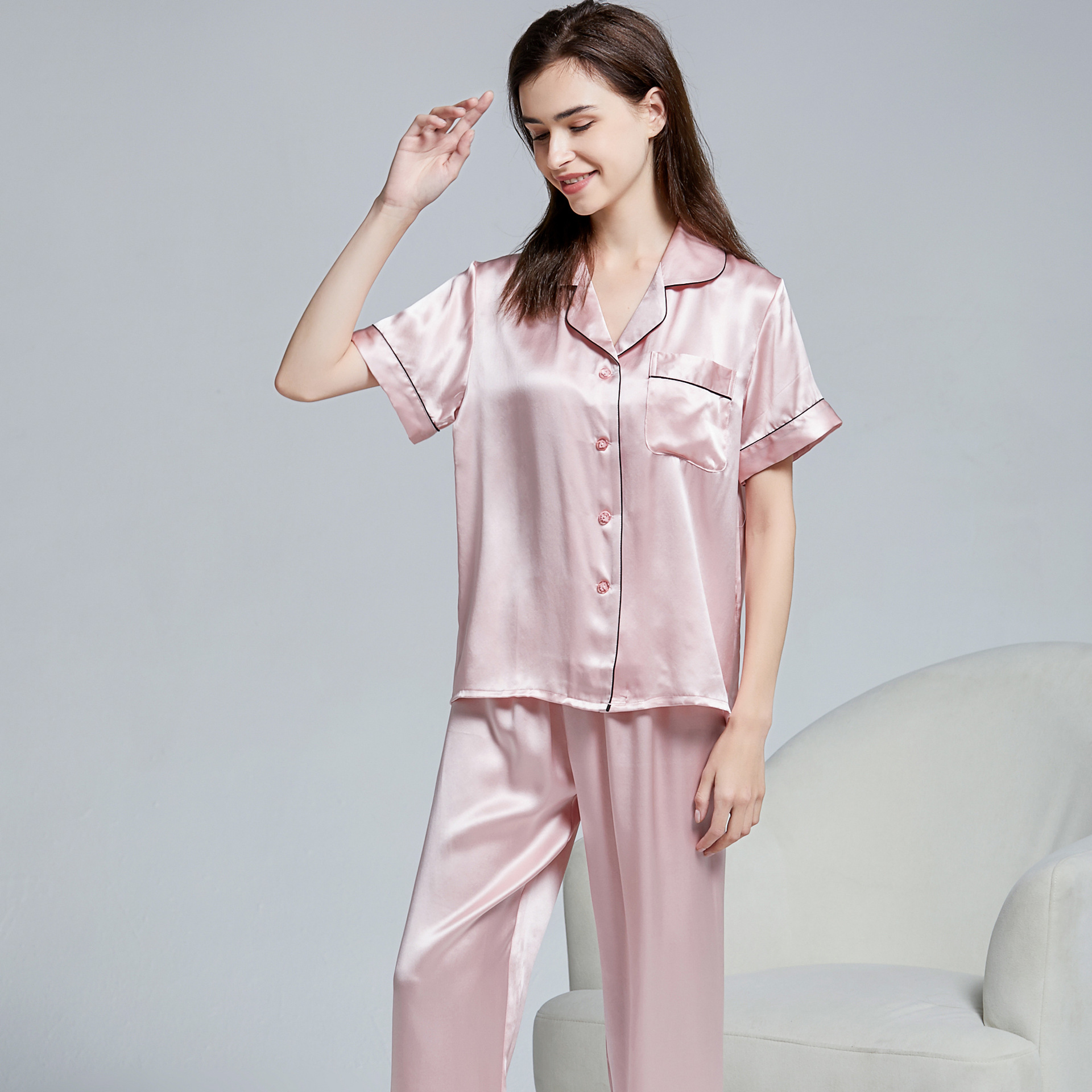 여성용 실크 잠옷 봄 여름 긴팔 투피스 슈트 100% 뽕나무 실크 여름 새 스타일은 집 밖에서 입을 수 있습니다스토어 가기