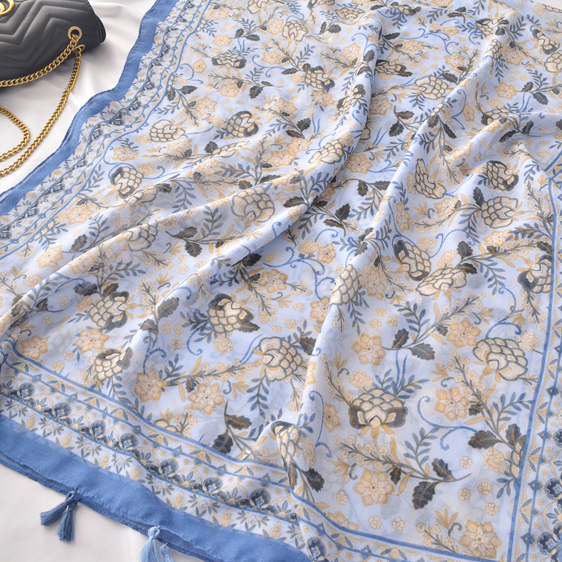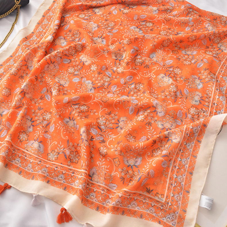 새로운 스타일 신선한 빛 럭셔리 오렌지 인쇄 술 거즈 봄과 여름 여행 자외선 차단제 비치 타올 숄 코튼 린넨 스카프
