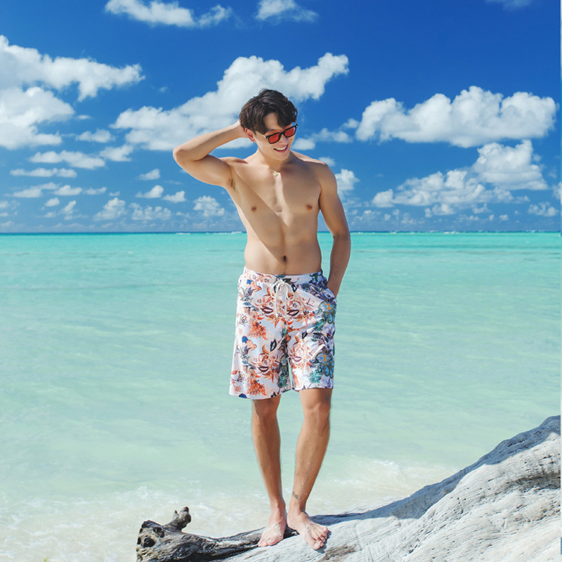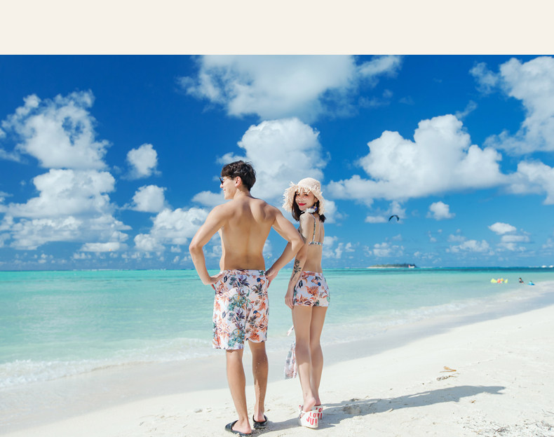 2025 새로운 커플 수영복 언더와이어 스플릿 복서 비키니 4 피스 온천 수영복 여성용 및 남성용 비치 바지스토어 가기
