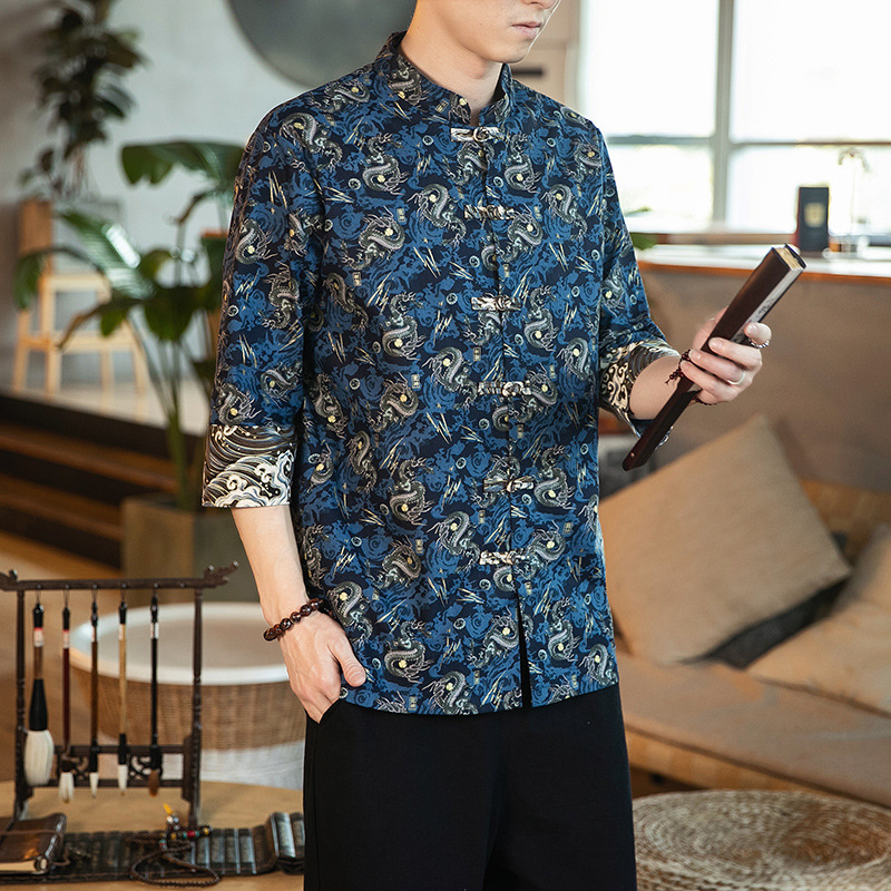 2020 봄 여름 중국 스타일 세븐 포인트 슬리브 셔츠 세로 칼라 느슨한 플러스 사이즈 인쇄 복고풍 버튼 셔츠 트렌디 남성